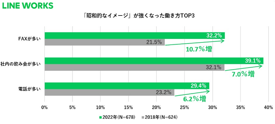 2018年調査と比較し、昭和的なイメージの働き方として回答率が高まった項目は、1位「FAXが多い」10.7%増(2022年調査32.2%、2018年調査21.5%)、2位「社内の飲み会が多い」7.0%増(2022年調査39.1%、2018年調査32.1 %)、3位「電話が多い」6.2%増(2022年調査29.4%、2018年調査23.2 %)となりました。