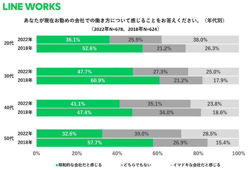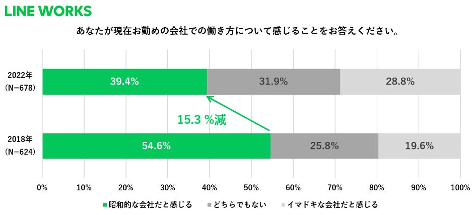 まず、コロナ禍におけるニューノーマルな働き方への対応やDX推進の波を受けて、業務にデジタルツールを導入する企業が増加したことで、自身が勤める会社を「昭和的」と評価する人の割合が大きく減少しました。