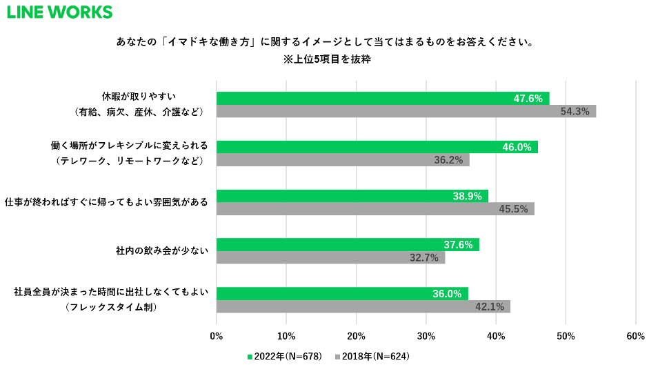 イマドキなイメージの働き方に関しては、「休暇が取りやすい(有給、病欠、産休、介護など)」が47.6%で最も多く、次いで「働く場所がフレキシブルに変えられる(テレワーク、リモートワークなど)」46.0%、「仕事が終わればすぐに帰ってもよい雰囲気がある」38.9%となり、2018年調査から1位を除いた上位項目の順位が変動しました。