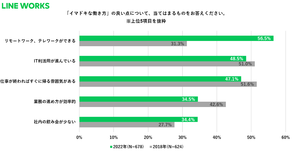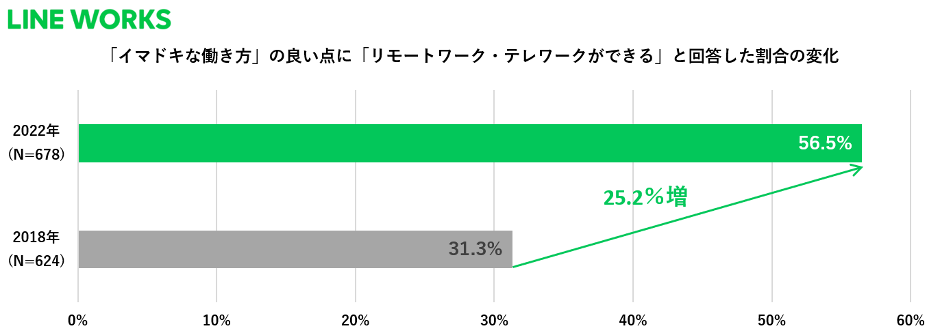 今回、“イマドキな働き方”の良い点として56.5%の回答を得た「リモートワーク・テレワークができる」は、2018年調査(31.3%)と比較して25.2%増加する結果となりました。