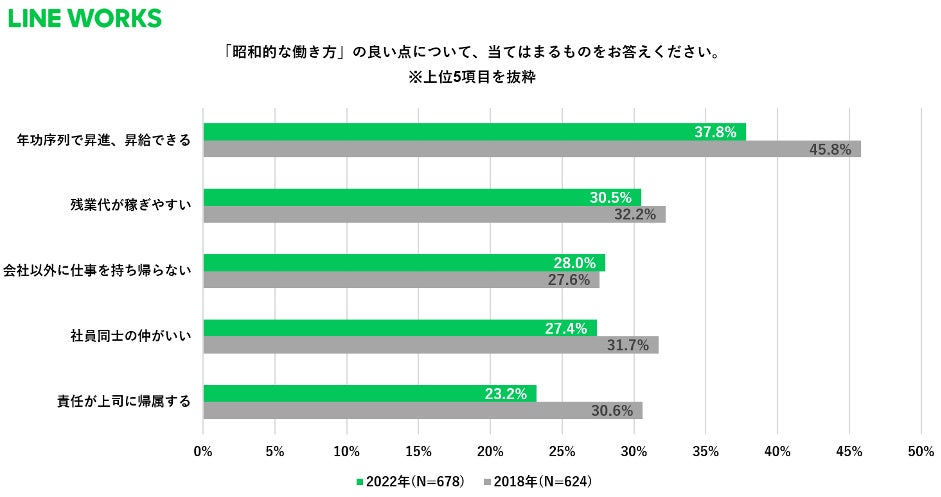 “昭和的な働き方”の良い点を聞いたところ、「年功序列で昇進・昇給できる」が37.8%で最も多く、次いで「残業代が稼ぎやすい」30.5%、「会社以外に仕事を持ち帰らない」28.0%という結果になりました。