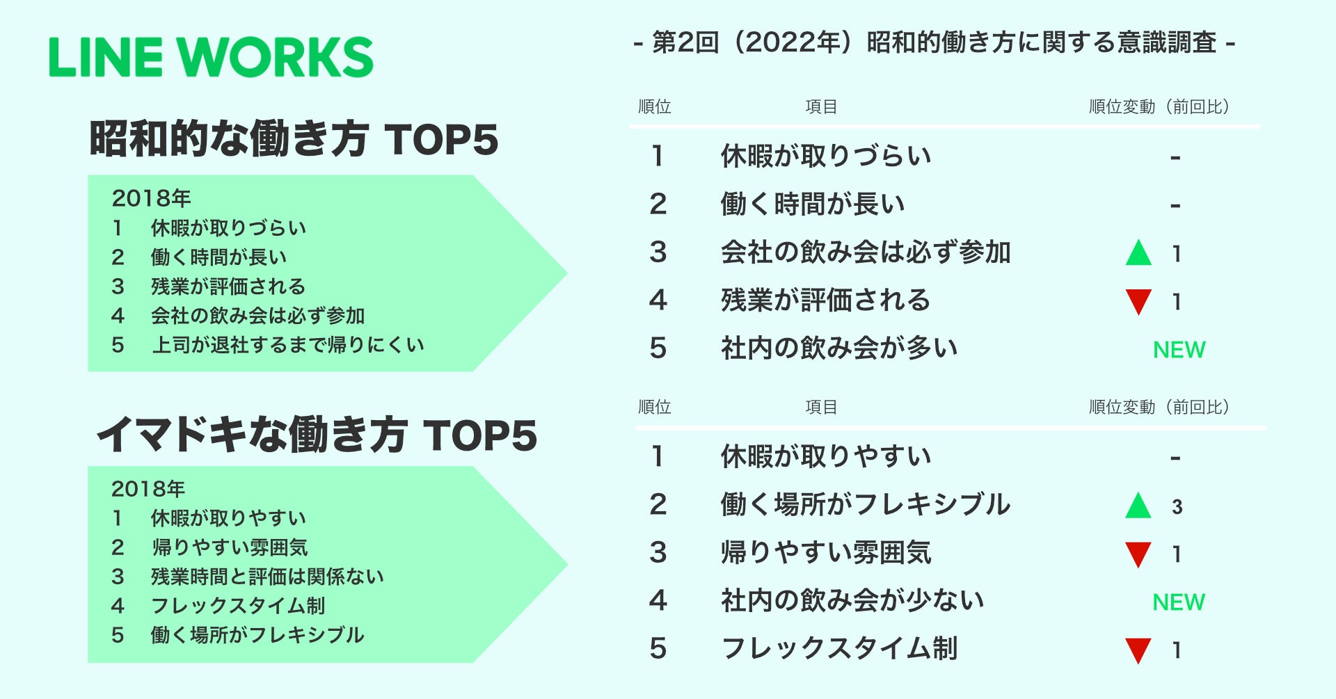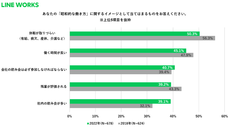 2018年に実施した前回調査と今回の調査結果を比較したところ、昭和的なイメージの働き方は、前回調査に引き続き「休暇が取りづらい」が1位になりました。また、新たに「社内の飲み会が多い」が5位にランクインしています。