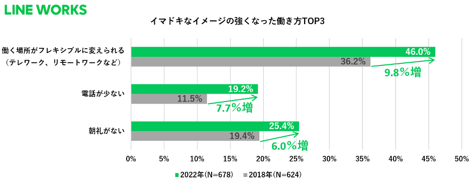 2018年調査と比較し、イマドキなイメージの働き方として回答率が高まった項目は、1位「働く場所がフレキシブルに変えられる(テレワーク、リモートワークなど)」9.8%増(2022年調査46.0%、2018年調査36.2%)、2位「電話が少ない」7.7%増(2022年調査19.2%、2018年調査11.5%)、3位「朝礼がない」6.0%増(2022年調査25.4%、2018年調査19.4%)となりました。
