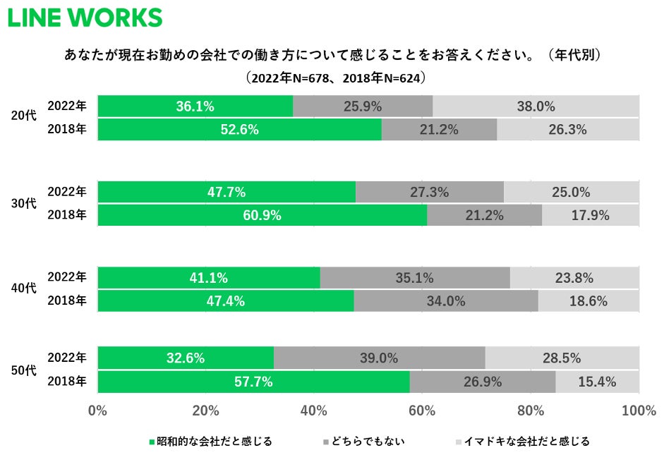 はたらく現場のコミュニケーションツール「LINE WORKS」を提供するワークスモバイルジャパン株式会社(本社:東京都渋谷区、代表取締役社長:福山 耕介、以下 ワークスモバイルジャパン)は、全国の企業に勤める20〜50代の会社員を対象に、2回目となる「昭和的働き方に関する意識調査」を実施しました。