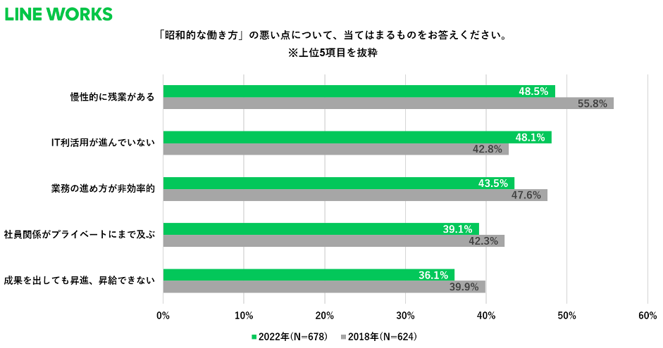 一方、“昭和的な働き方”の悪い点は、回答が多い順に「慢性的に残業がある」48.5%、「IT利活用が進んでいない」48.1%、「業務の進め方が非効率的」43.5%と続きました。