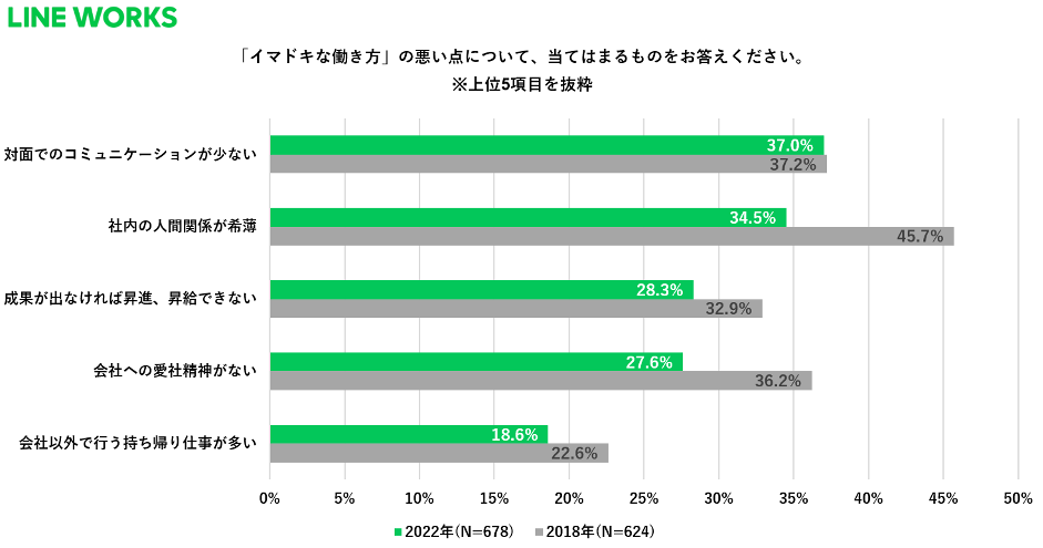 一方、“イマドキな働き方”の悪い点は、回答が多い順に「対面でのコミュニケーションが少ない」37.0%、「社内の人間関係が希薄」34.5%、「成果が出なければ昇進、昇給できない」28.3%と続きました。
