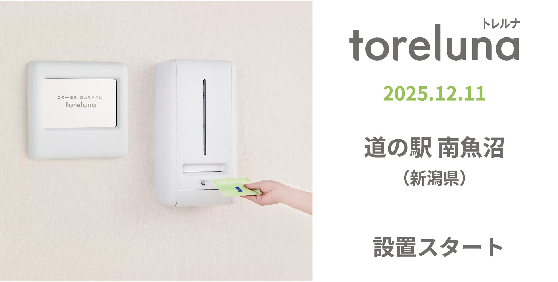 株式会社ネクイノ(大阪市北区、代表:石井 健一)は、トイレの個室で生理用ナプキンを常備し無料で提供するサービス「toreluna(トレルナ)」(以下 トレルナ)を、道の駅 南魚沼へ設置し、サービスの提供を開始いたしました。
