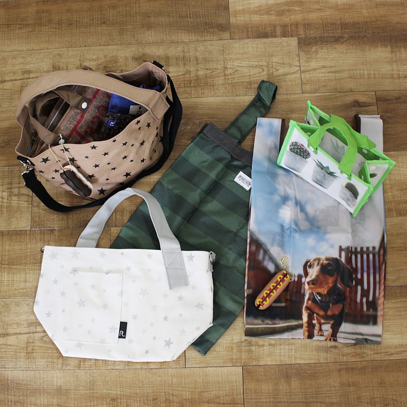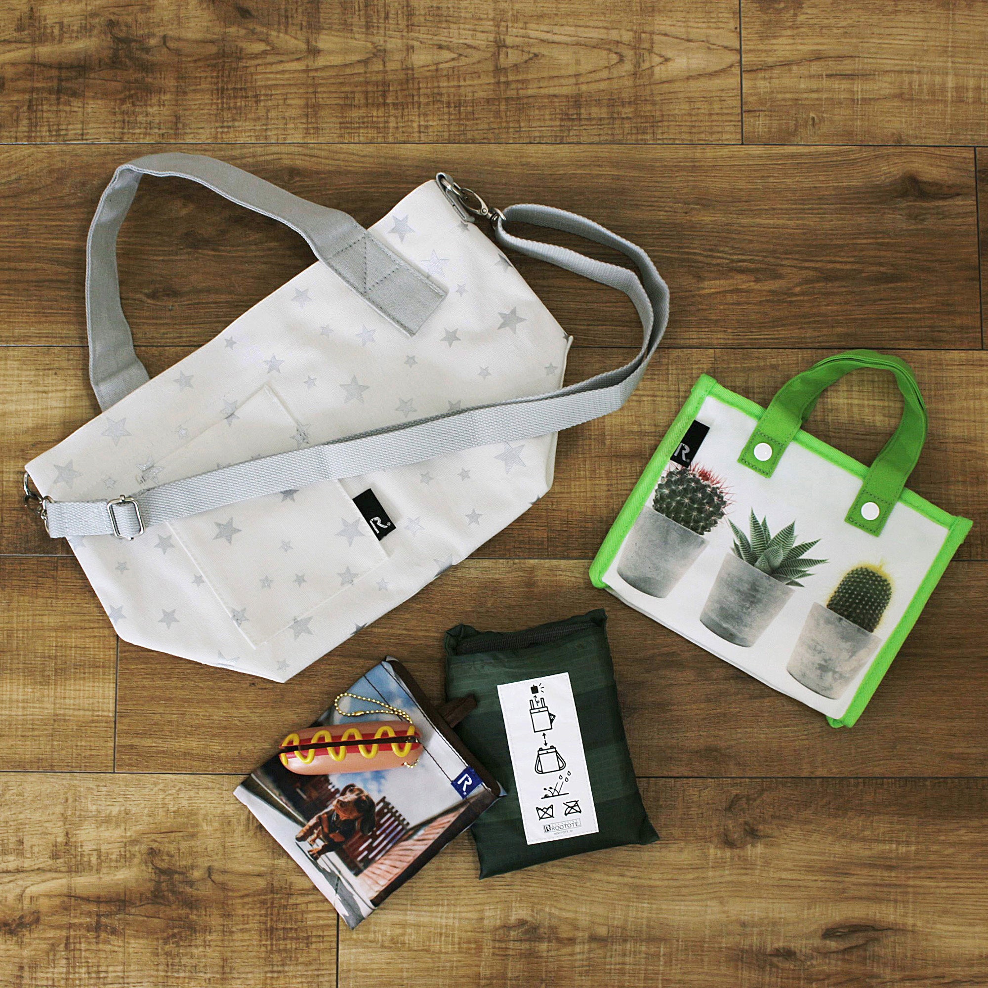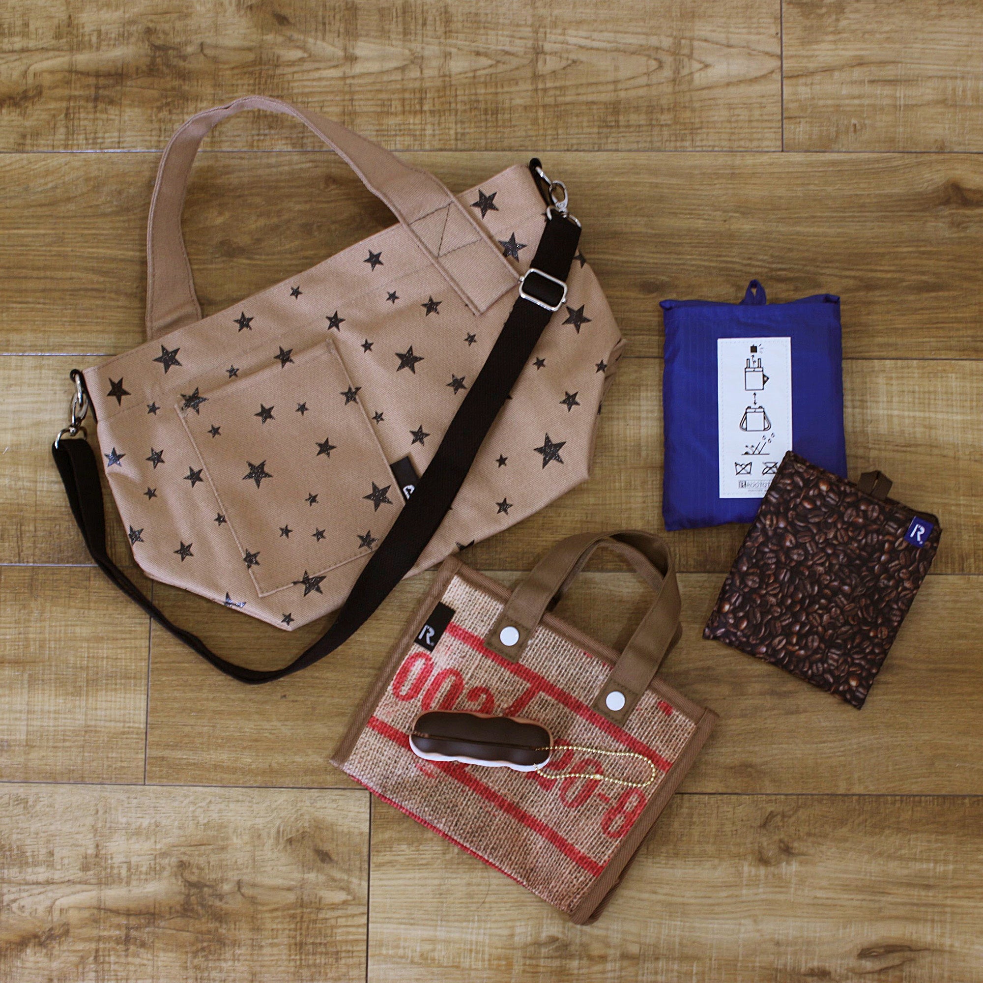 セット内容:ショルダー付き2WAYタイプの星柄トート「デリ スター」、背負える2WAYタイプのエコバッグ「セオルーショッパー」、レジ袋タイプのエコバッグ「ルーショッパー」、グリップ機能付きチャーム「ルーグリップ」、卓上タイプのゴミ箱になるトート「ルー・ガービッジ Desktop」