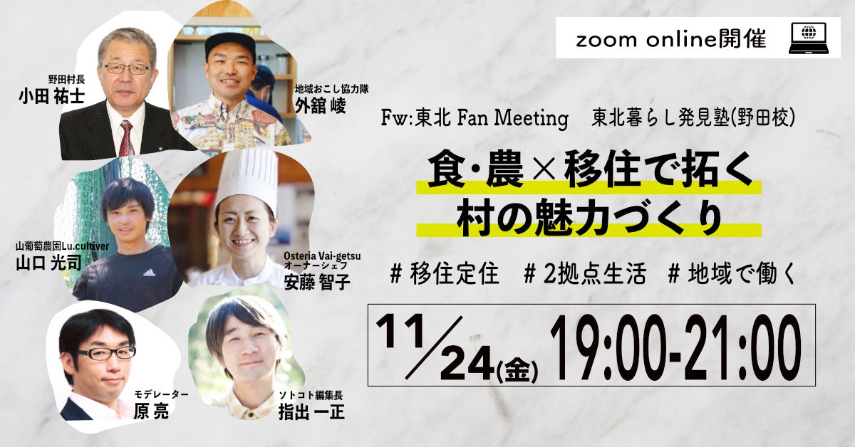 11/24開催【Fw:東北 Fan Meeting 2023 東北暮らし発見塾(野田校)〜食・農×移住で拓く村の魅力づくり】