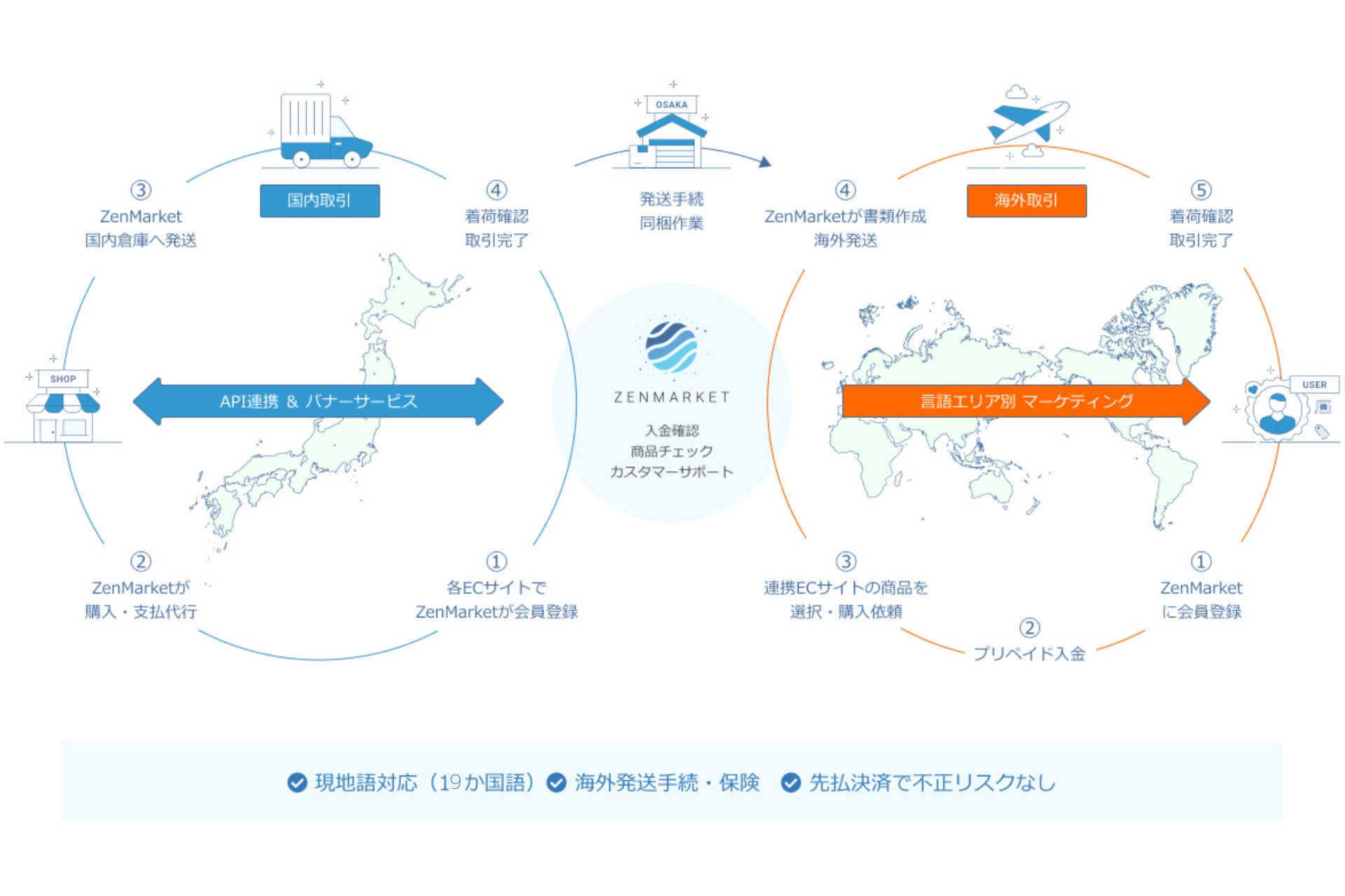 海外向け購入代行サービス「ZenMarket」、海外向けサブスクリプションパック(定期購入サービス)「ZenPop」、海外越境ECモール「Zenplus」を運営。海外発送業務は弊社が全て引き受けています。