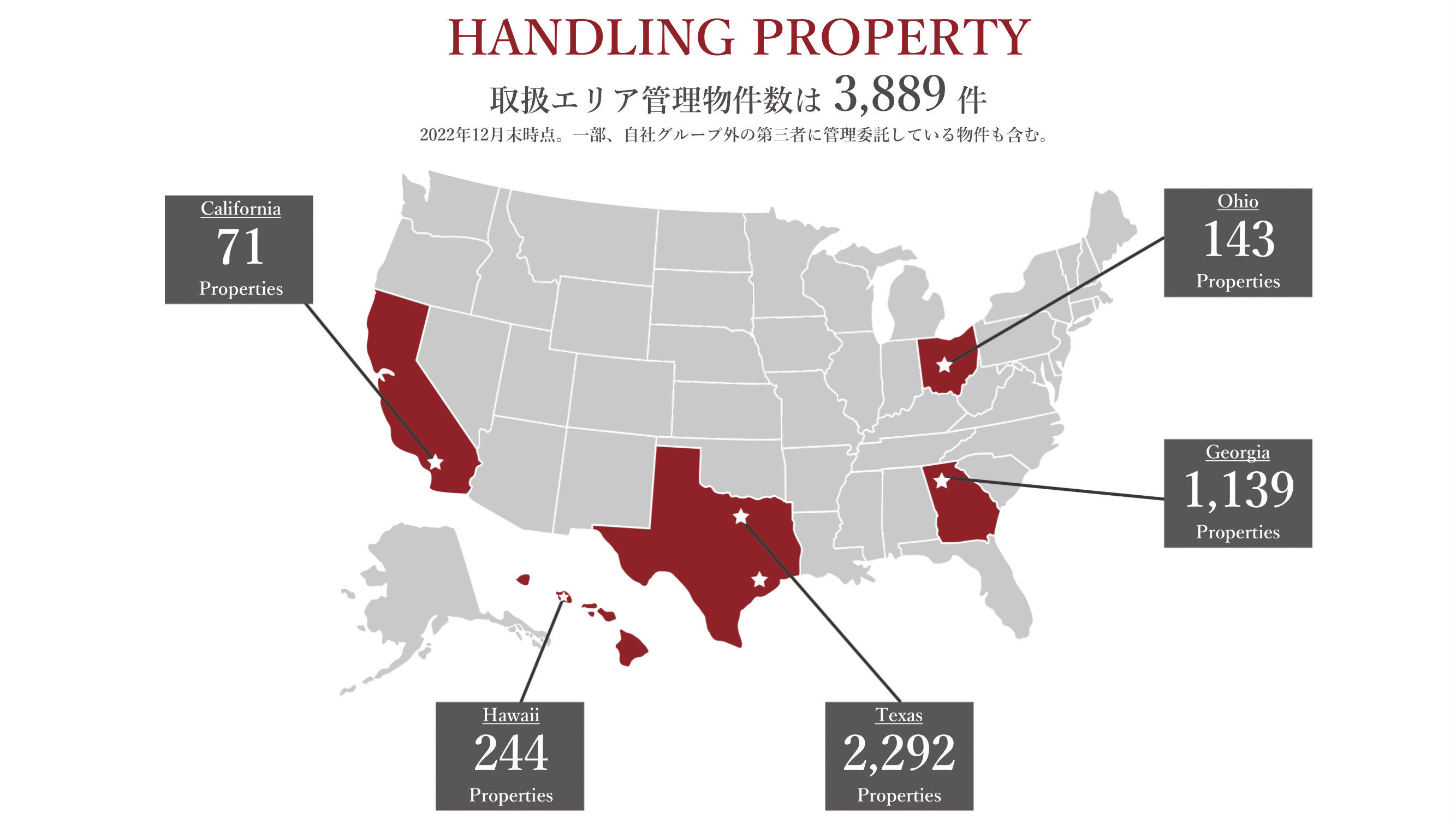 当社グループは、2017年8月より本格的に海外不動産事業を始動して以降、「アメリカ不動産をもっと身近に」をミッションに、業界でも群を抜く販売実績と管理実績で、名実ともにアメリカ不動産のパイオニアとしての地位を確立してまいりました。2022年1月には現地アメリカでの管理物件数が3,000棟を突破、6月にはテキサス州で2,000棟、7月にはジョージア州で1,000棟を突破いたしました。また、2022年10月にはオーナー様が2,000名に、当社グループ及び米国子会社の年間引渡棟数が1,000件に達しました。