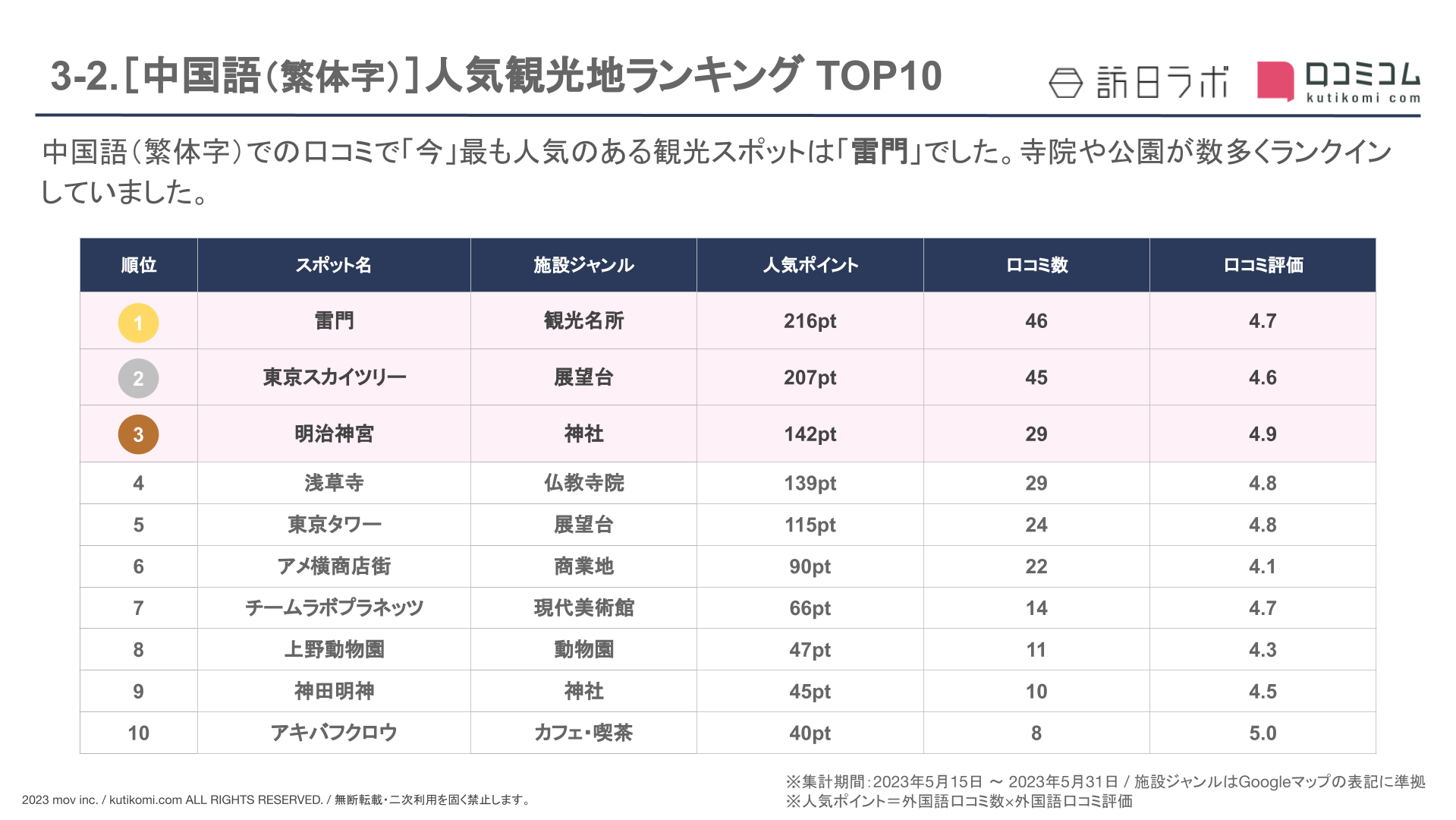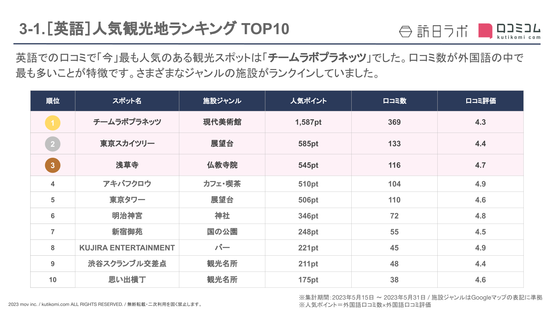 英語・中国語・韓国語ほか5言語別の人気ランキングや外国語口コミ率9割超えのスポットも紹介