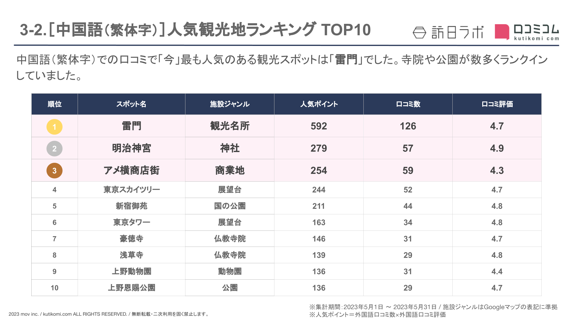 また、台湾や香港で用いられる中国語(繁体字)の人気ランキングは、英語と異なる結果となりました。中国語では、ある施設ジャンルが数多くランクインしていました。