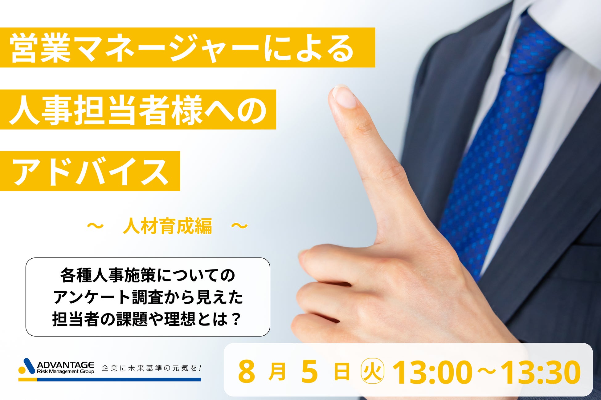 株式会社アドバンテッジリスクマネジメントは、2025年8月5日(火)に人材育成の担当者様/責任者様を対象としたWebセミナー「営業マネージャーによる人事担当者様へのアドバイス(人材育成編)」を開催いたします。