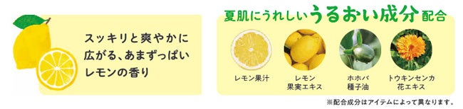 あまずっぱいレモンがスキッと爽やかに香る「レモン」シリーズが今年も数量限定で発売!夏の肌をうるおしながら整える“あっつい夏”を爽やかに楽しむアイテムは初夏を感じさせる爽やかなパッケージで、自分使いはもちろん、ちょっとしたギフトにもぴったりです。