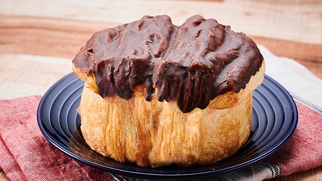 バターを折り込んだ生地を何層にも重ねて焼き上げたフレーキーにチョコをたっぷりとかけました。
