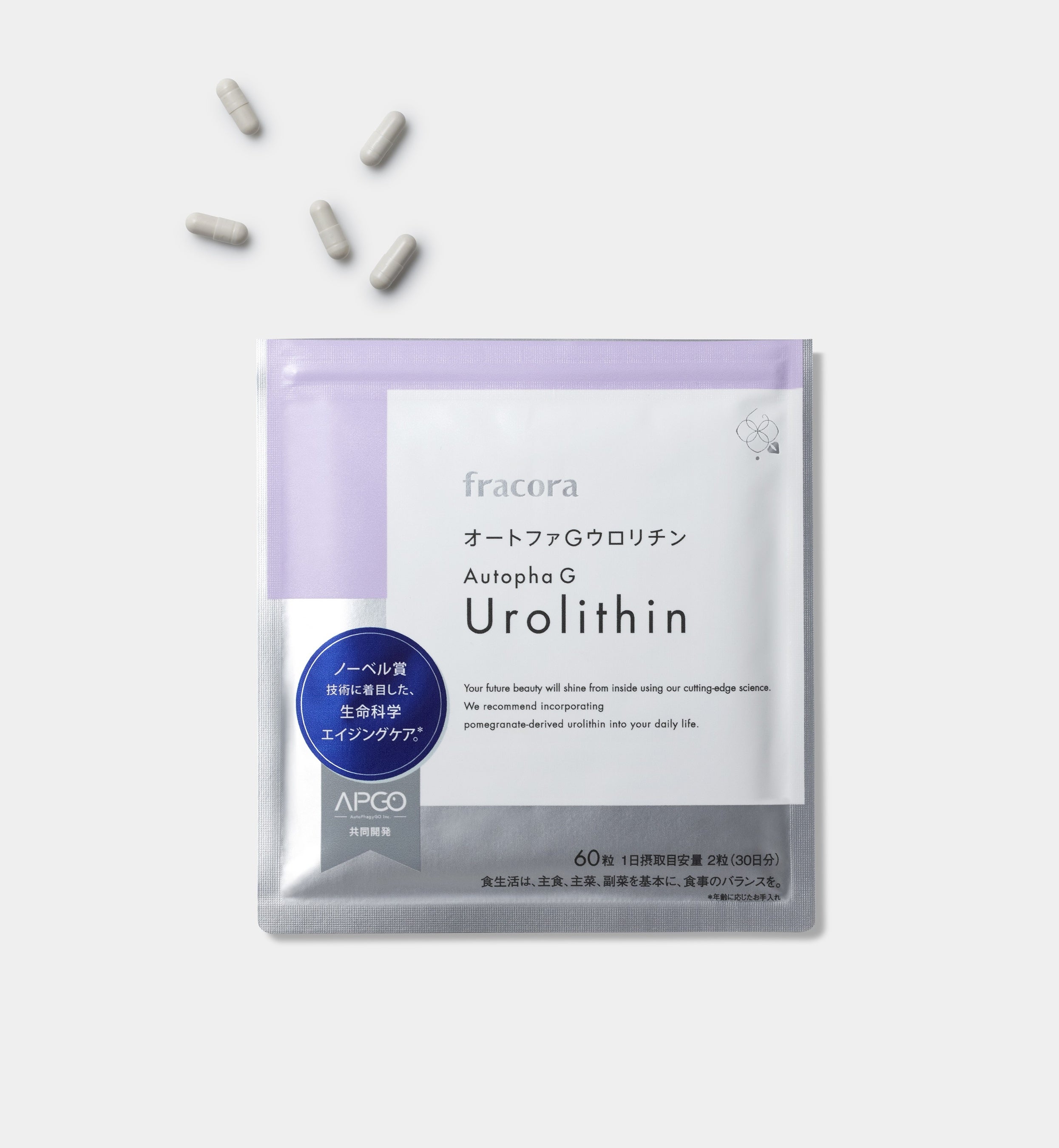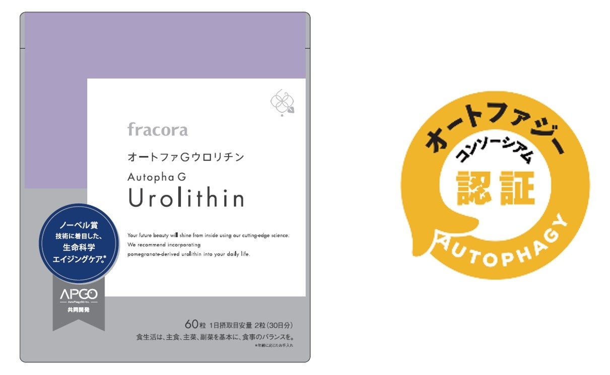 美しさは肌細胞*³から生まれる。生命科学に着目し、革新的な商品を提供しているトータルビューティブランド「fracora(フラコラ)」は、オートファジーに注目した、ウロリチンA配合サプリメント「オートファGウロリチン」が日本初*オートファジー認証マークの表示承認を受けたことをお知らせいたします。これは一般社団法人日本オートファジーコンソーシアムが定める規格基準に合格した成分*⁴を配合している商品のみに表示されるマークです。