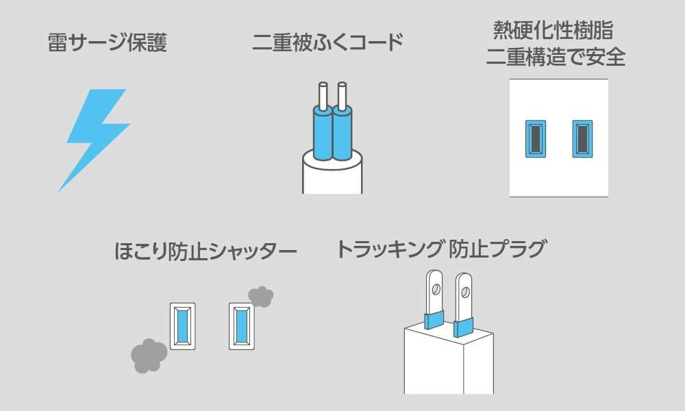 AC差込口は、ACアダプター同士が干渉しにくいように間隔を開け、角度をずらして配置しています。また、火災などのリスクを軽減するため、熱硬化性樹脂や難燃性樹脂を用いた二重構造にするなど安全性を重視した設計になっています。