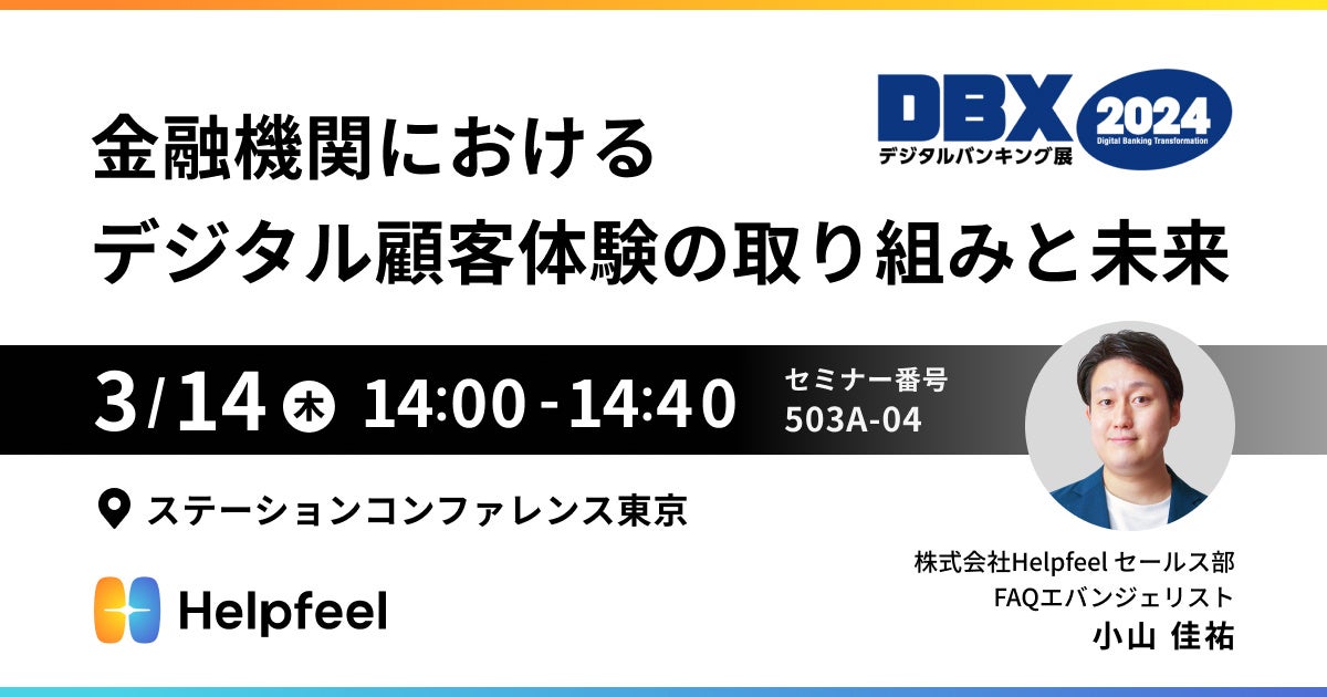 株式会社Helpfeel(京都府京都市、代表取締役/CEO:洛西 一周、以下 当社)は、2024年3月14日(木)〜3月15日(金)に開催される株式会社日本金融通信社(ニッキン)主催の金融総合イベント「デジタルバンキング展(DBX2024)」に出展し、当社 セールス部FAQエバンジェリストの小山が登壇することをお知らせいたします。