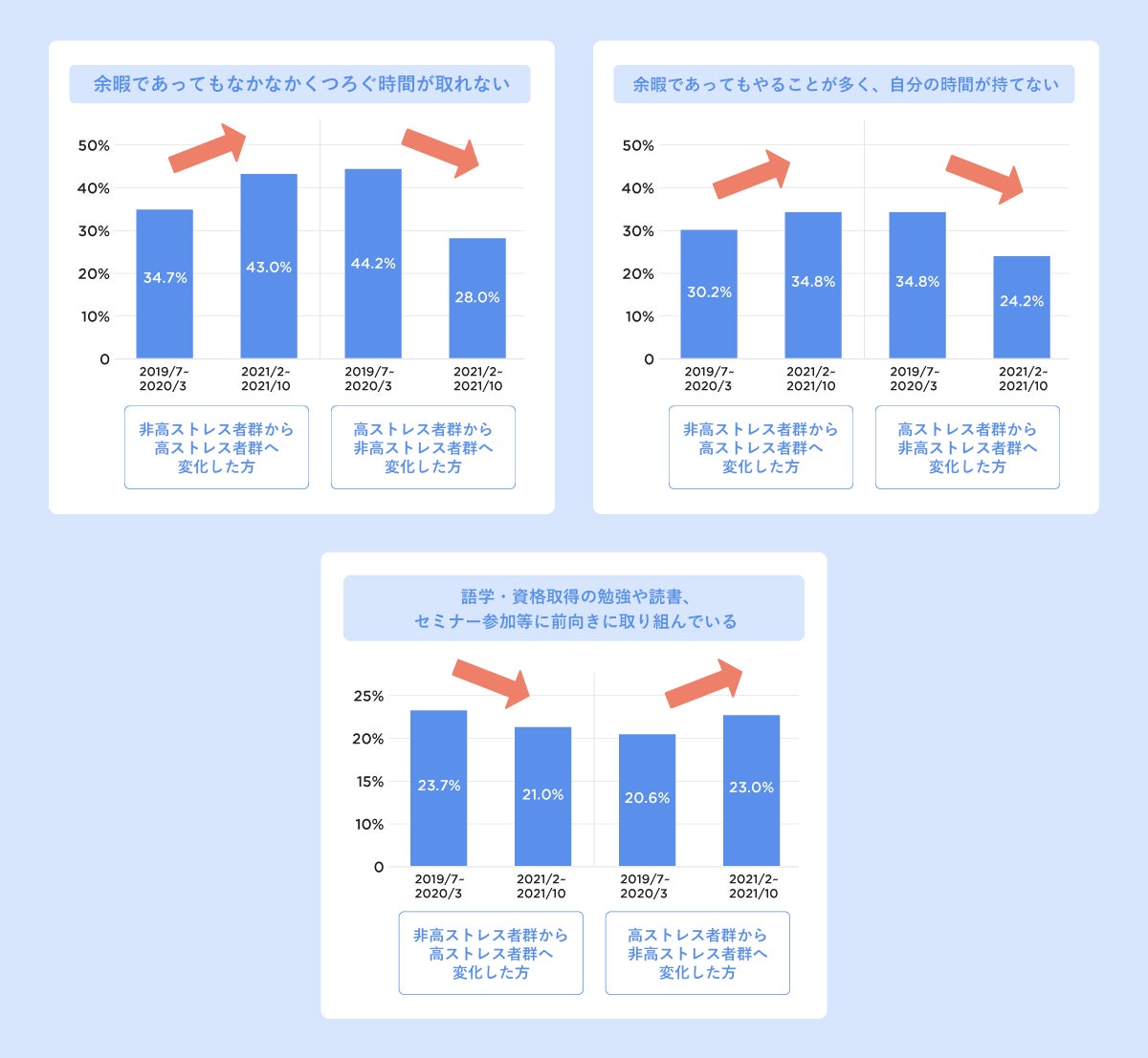 分析方法:回答を高ストレス者群・非高ストレス者群※6に分け、期間前後での各群でのサーベイの回答結果の変化を分析。そのうち、非高ストレス者群から高ストレス者群へ変化した方の回答2,543件、高ストレス者群から非高ストレス者群へ変化した方の回答2,897件を設問ごとに前後比較(各期間で2回以上回答している場合、時期が早い回答で比較)。