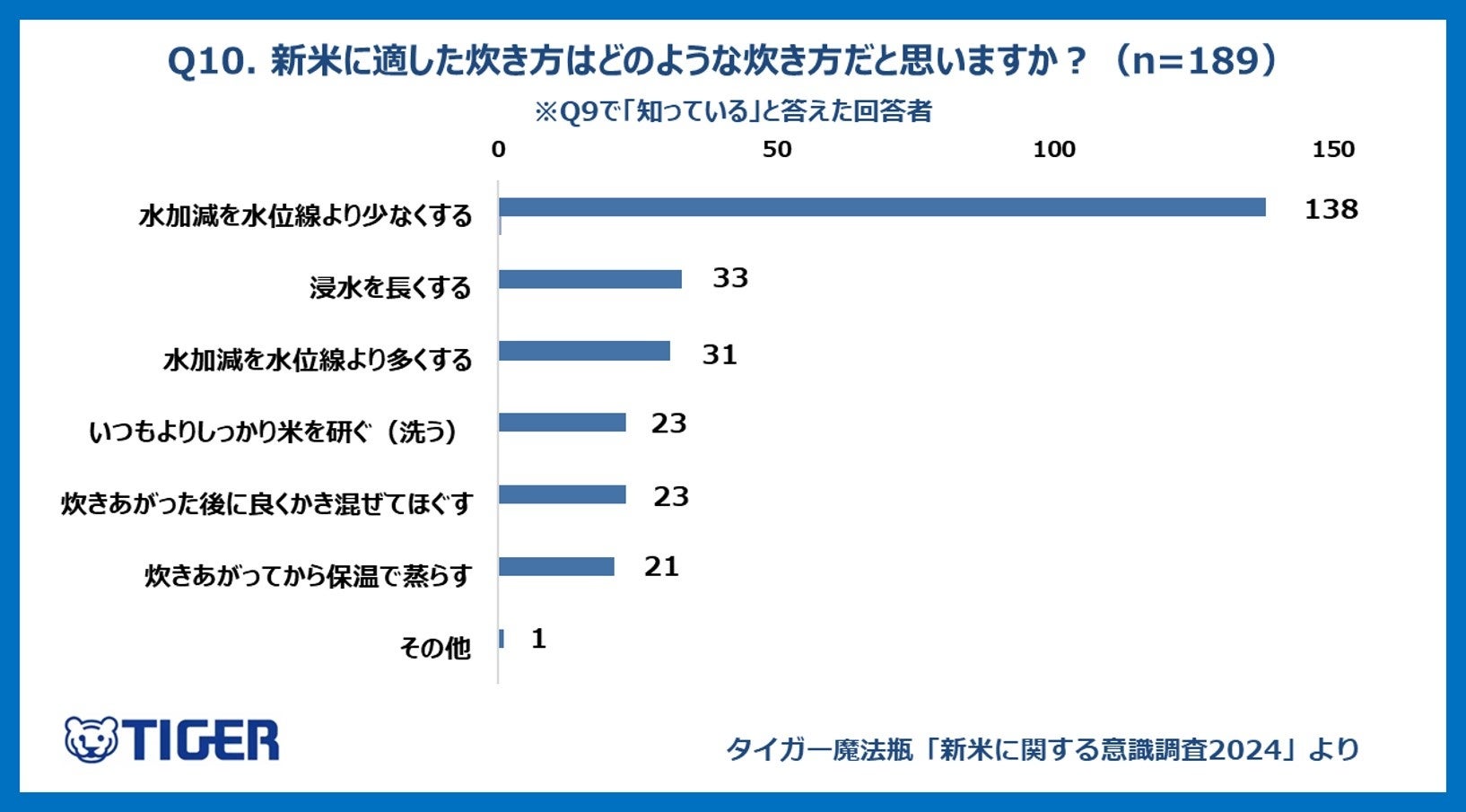 また、新米の炊き方に関する質問では、正しい炊き方である「水かげんを水位線より少なくする」を選択した人は73.0%と広く認識されていた一方で、「いつもよりしっかり研ぐ」「浸水を長くする」など新米に適さない方法でお米を炊いている人もいることが判明しました。