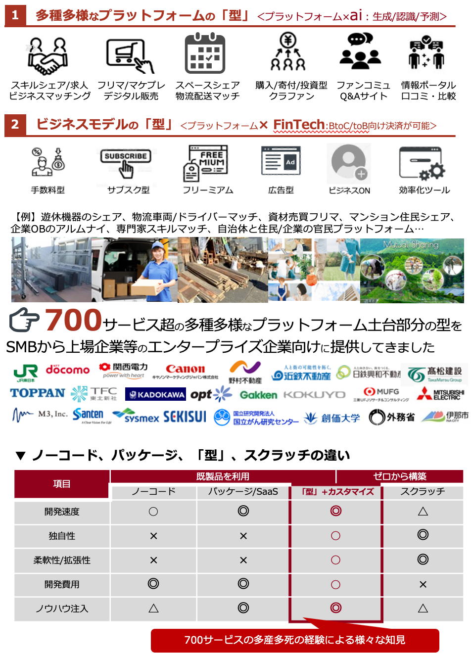 弊社のアプローチは、過去700サービスのノウハウの詰まった「型」を組み合わせて提供するので、導入初期のコストと時間を大幅に削減できます。通常、WEBプラットフォームの開発には半年から1年かかり、費用は1,000万円程度ですが、「型」を利用することで、開発期間は2-3ヶ月、初期費用は100万円に短縮できます。