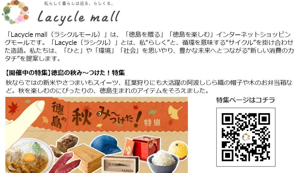 「Lacycle mall(ラシクルモール)」は、「徳島を贈る」「徳島を楽しむ」インターネットショッピングモールです。「Lacycle(ラシクル)」とは、私“らしく”と、循環を意味する“サイクル”を掛け合わせた造語。私たちは、「ひと」や「環境」「社会」を思いやり、豊かな未来へとつながる“新しい消費のカタチ”を提案します。