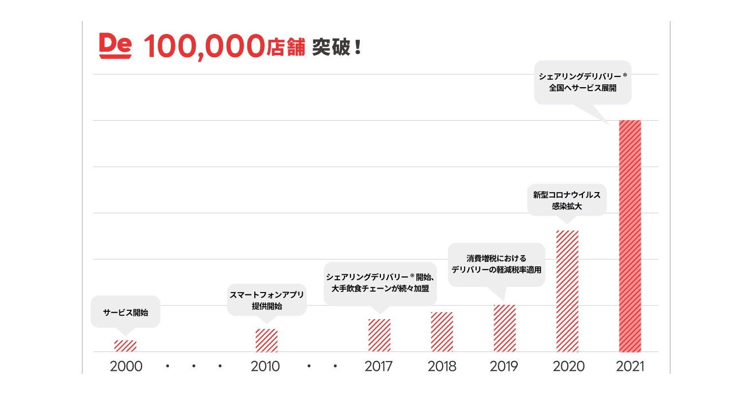 そして、全国47都道府県での「シェアリングデリバリー®」のサービス展開を完了した2021年に、100,000店舗突破となりました。