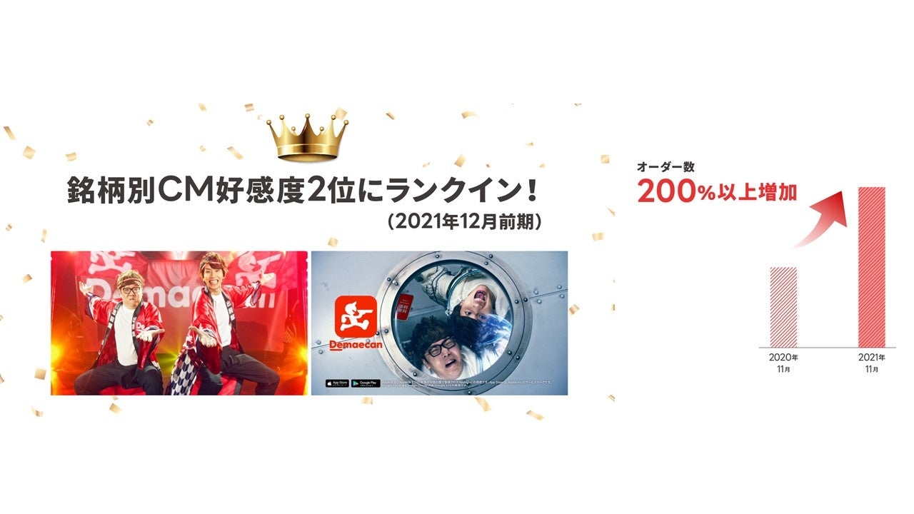 『出前館』のテレビCMが好感度ランキング第2位にランクイン!キャンペーン効果により、一都三県のオーダー数は昨年対比200%以上、加盟店舗数も10万店舗を突破!