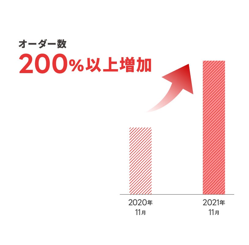 さらに『出前館』の加盟店数も100,000店舗突破※2となりました。『出前館』は、2000年にサービスを開始し、スマートフォンアプリの提供を開始した2010年の加盟店舗数は、約10,000店舗でした。サービス開始当初は、加盟店が自らお届けまで担う自社配達の店舗のみで、プラットフォームとしての役割が強い傾向にありましたが、2017年に開始されたシェアリングデリバリー®※3の拡大とともに、大手飲食チェーンや地元の人気店が続々と加盟に至りました。その後、2020年の新型コロナウイルス感染拡大という未曽有の事態をきっかけとして、飲食に関わる業界は営業の形態が大きく変わり、その中でもデリバリー・テイクアウトへの意識が変化したことが、加盟店数の増加に繋がったと考えられます。