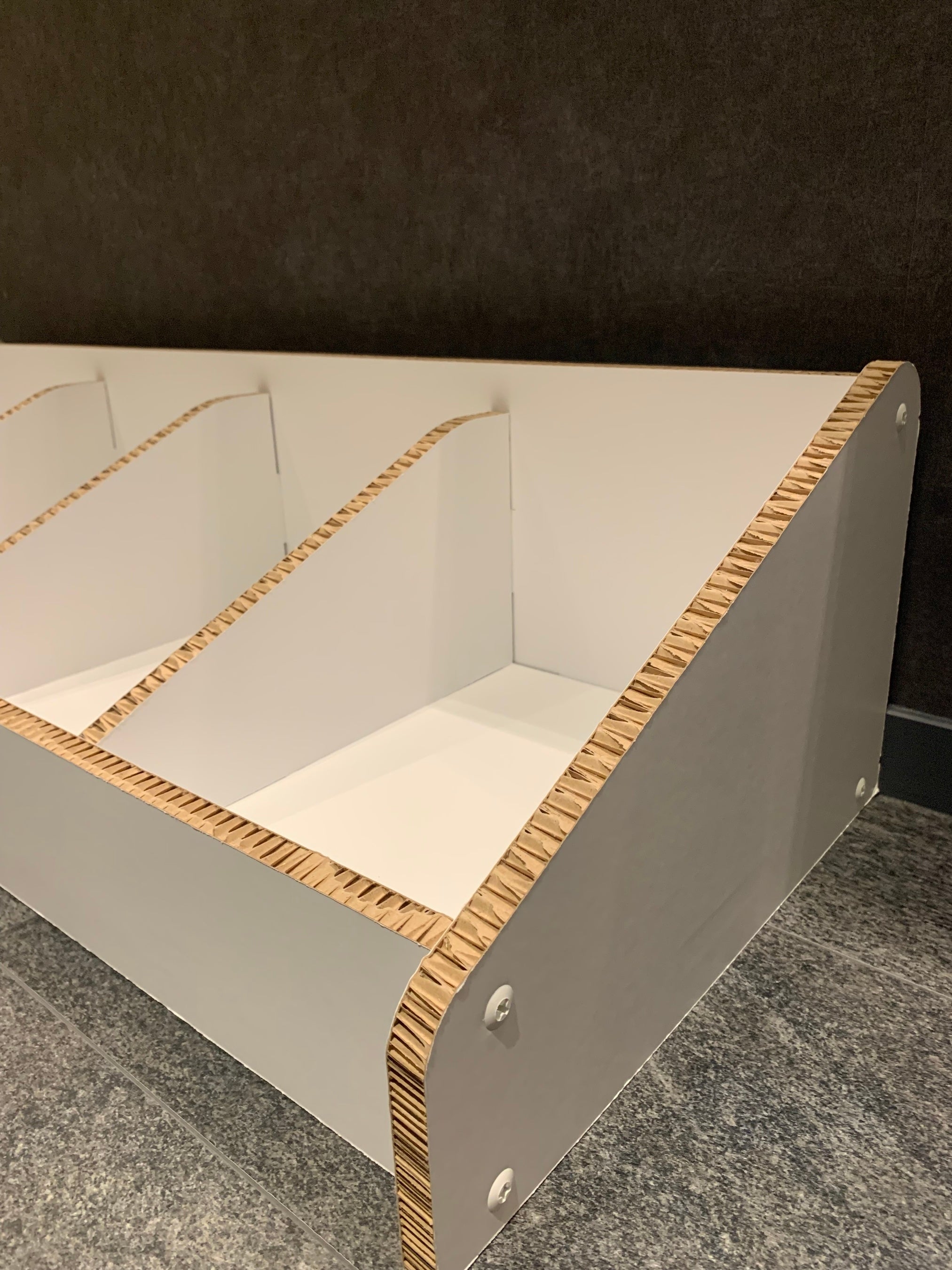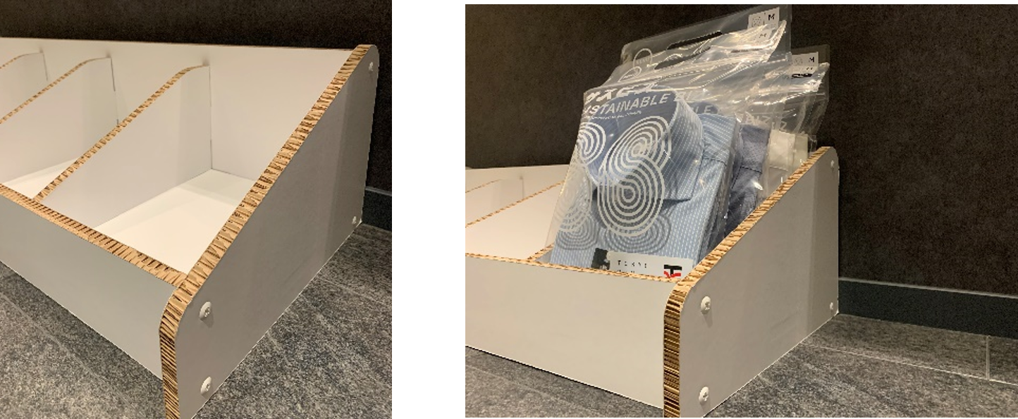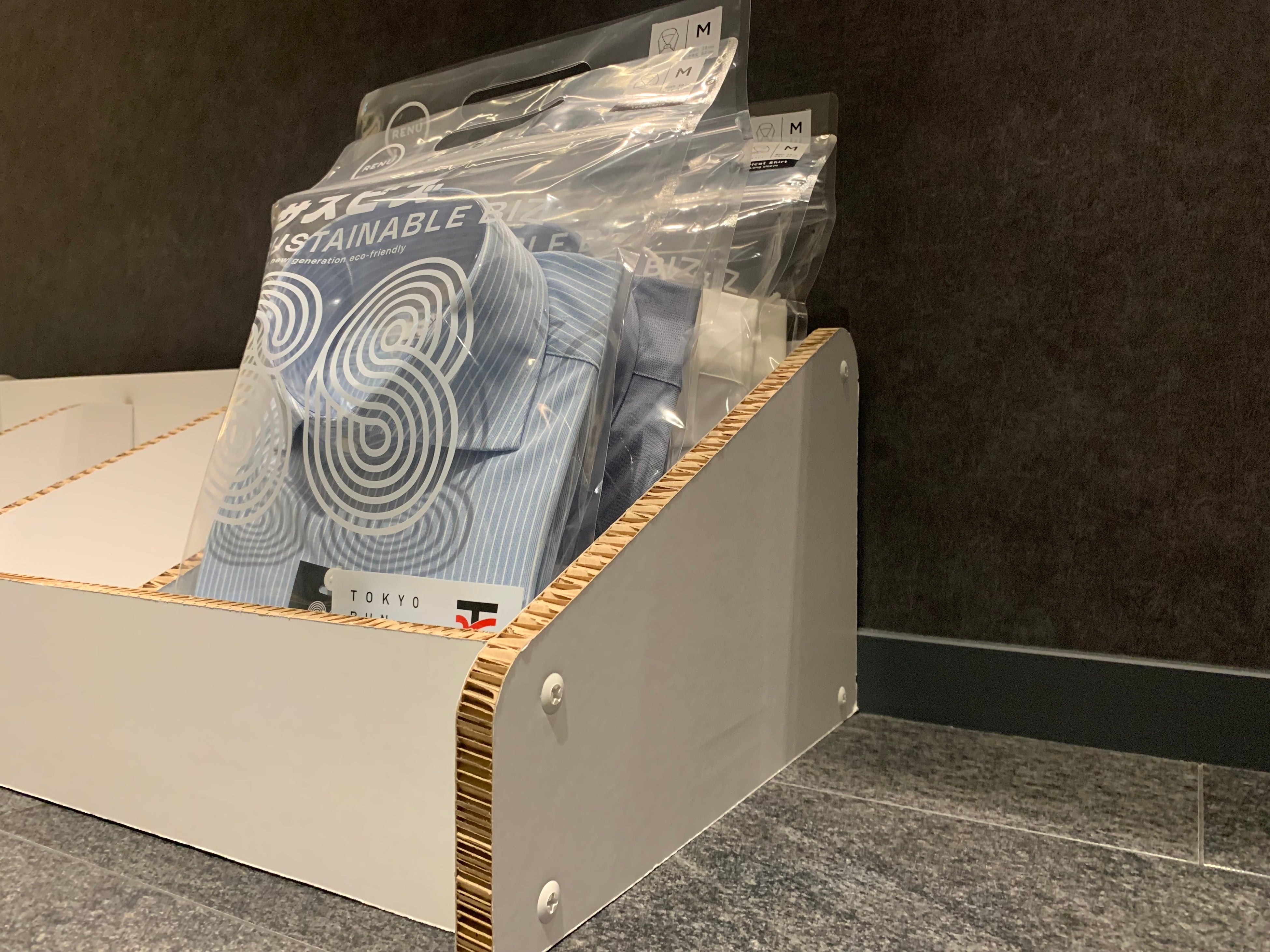 :リサイクル可能な紙素材100%で作られたシャツ什器。