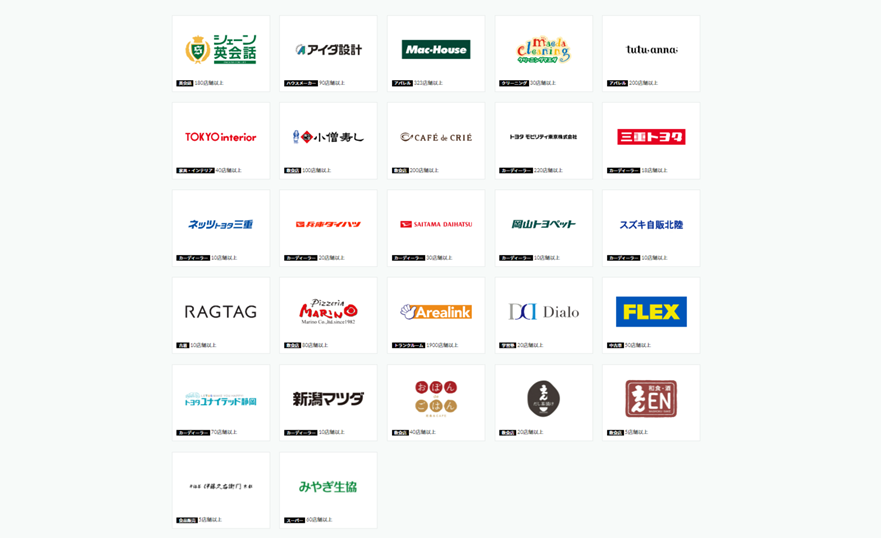 飲食チェーン、アパレル、カーディーラー、家具・インテリア、ハウスメーカー、トランクルーム、学習塾、自治体(観光事業)など、多様な業種への導入実績があります。