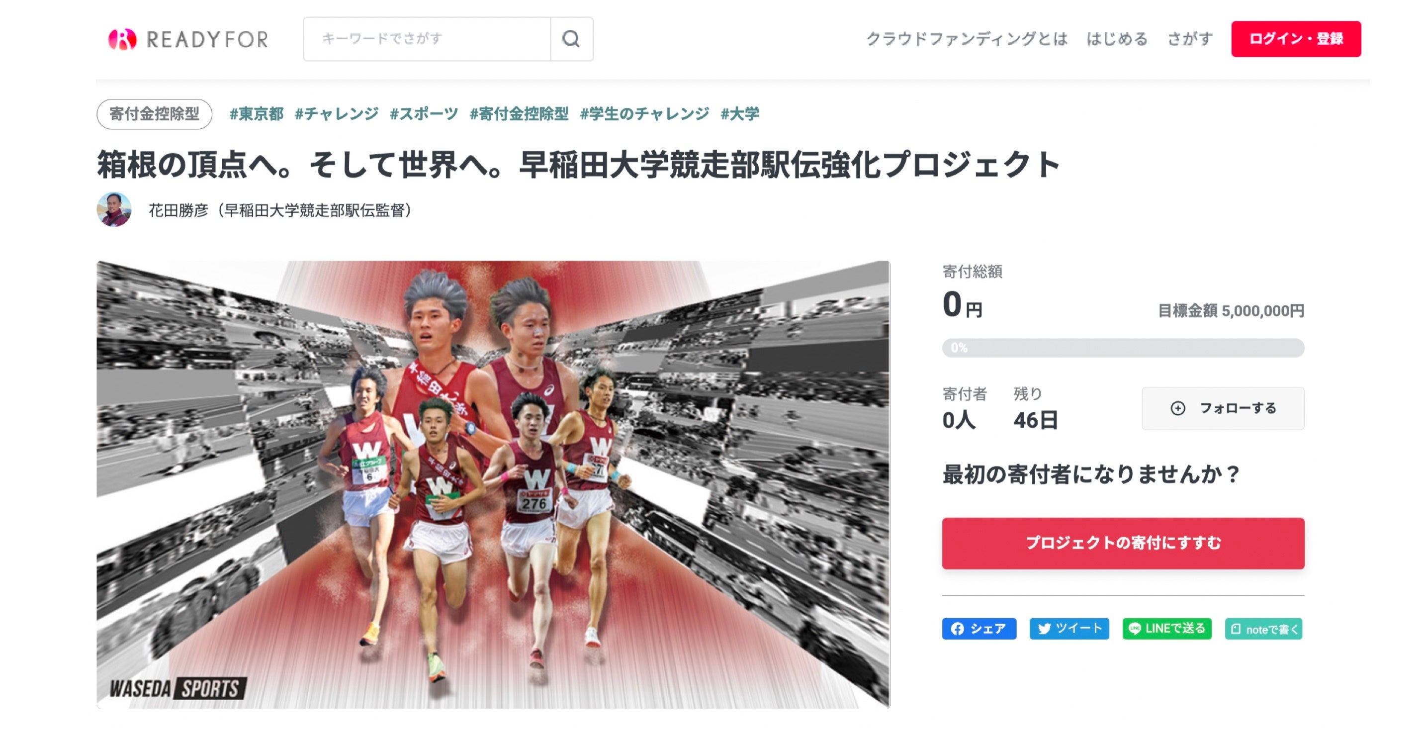 日本初・国内最大級のクラウドファンディングサービス「READYFOR」を運営するREADYFOR株式会社(本社:東京都千代田区、 代表:米良はるか)と早稲田大学(所在地:東京都新宿区、総長:田中愛治)は業務提携を締結し、本日、提携後第一号としてクラウドファンディングプロジェクト「箱根の頂点へ。そして世界へ。早稲田大学競走部駅伝強化プロジェクト」を開始いたしました。