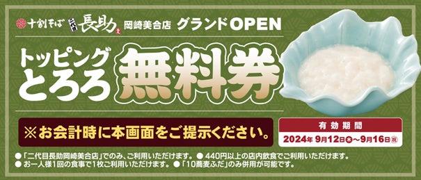 また、岡崎美合店限定でご利用いただける「トッピングとろろ無料券」を記載いたしました。この画面を掲示で期間中、何度でもご利用いただけます。