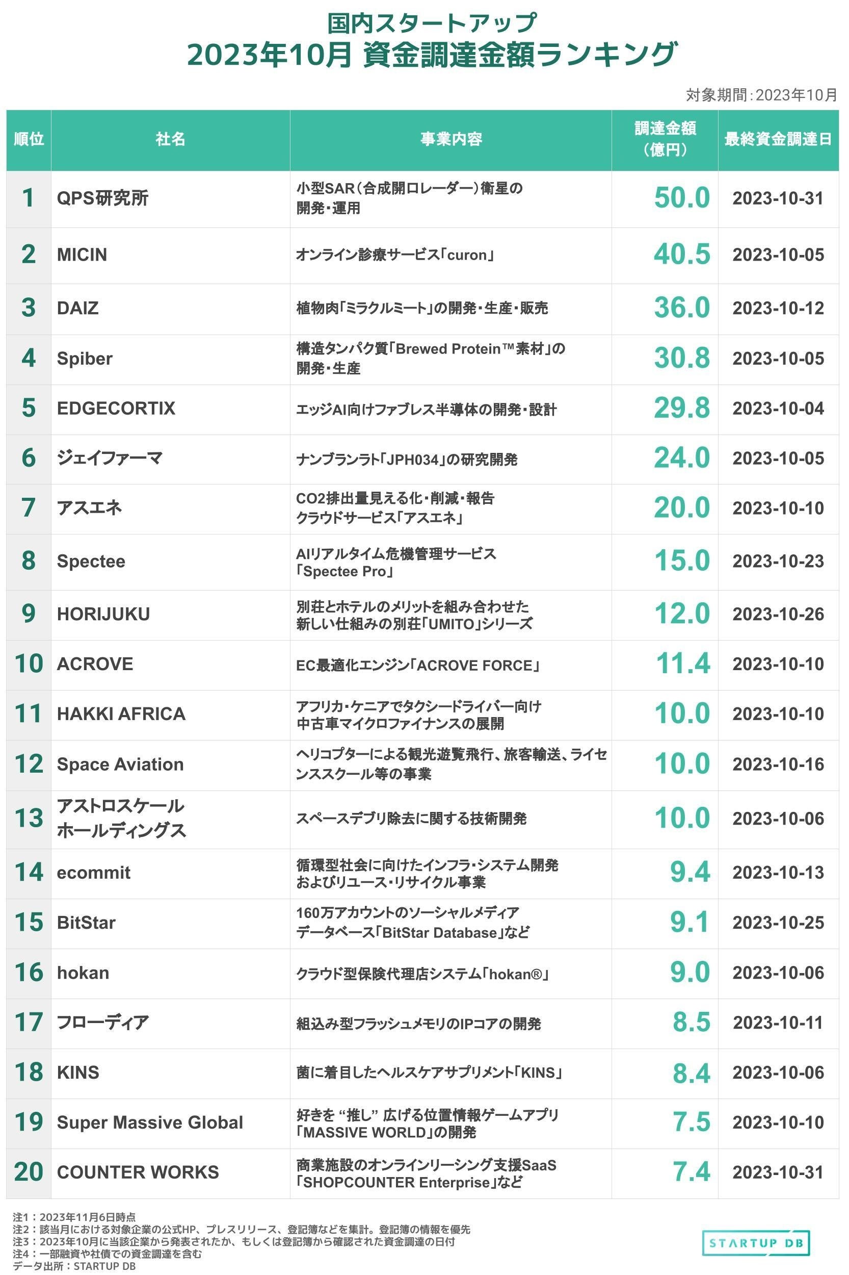 【STARTUP DB】調査結果 国内スタートアップ資金調達金額ランキング(2023年10月)