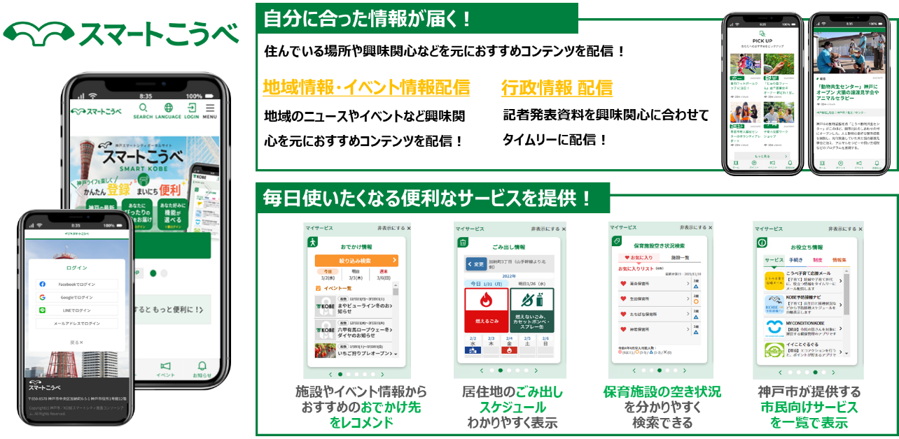 西日本電信電話株式会社 兵庫支店(支店長:樋口 浩子/以下、NTT西日本)は、神戸市よりスマートシティ推進支援業務を受託し、神戸市が掲げる「Human×Smart City KOBE」の実現に向けて共に取り組んでおります。この度、NTT西日本グループのNTTビジネスソリューションズ株式会社との連携により、市民向けのスマートシティポータル「スマートこうべ」(以下、スマートこうべ)を設計・構築し、2022年3月28日より運用開始することとなりました。
