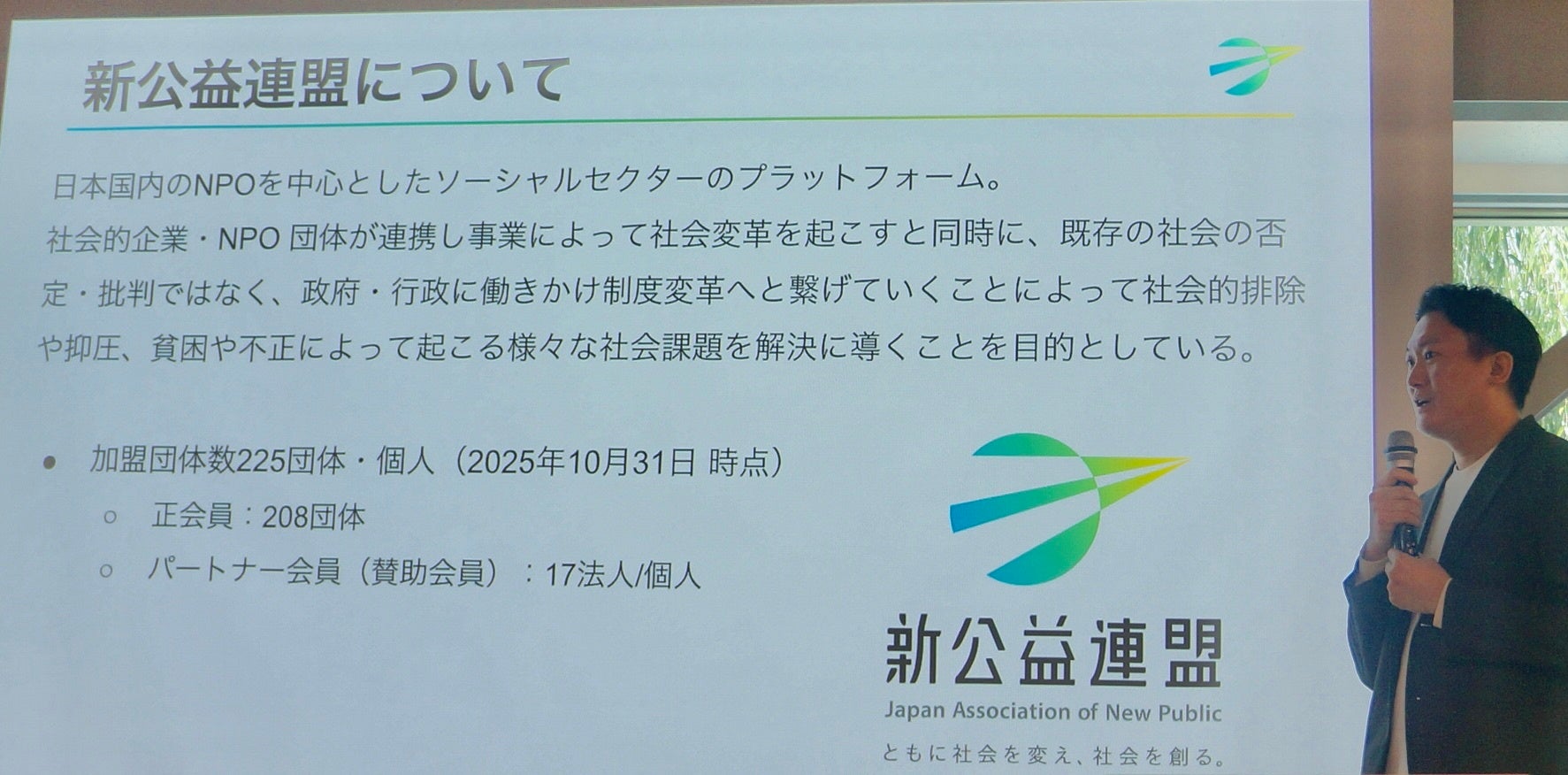 新公益連盟は、日本国内のNPO・社会的企業が200団体以上加盟する連盟組織です。共同代表の李 炯植 氏より「食料品以外の物品寄贈・寄付の全額損金算入」や「みなし譲渡所得課税の税制改正」「遺贈寄付に関する障壁の改善」など8つの提言が行われました。