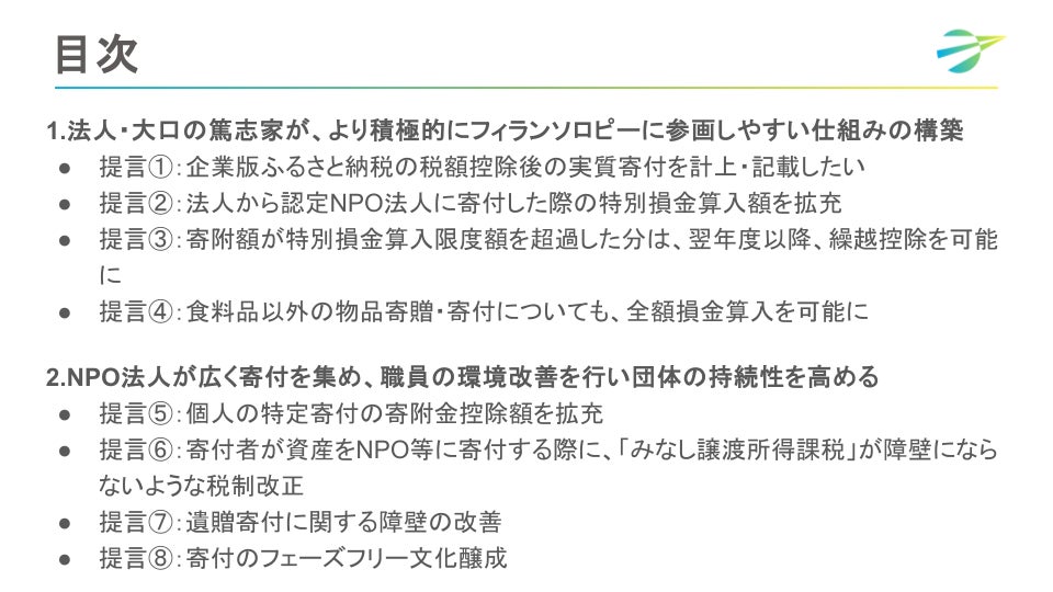 現状の課題として、寄付の意向があったとしても制度的なハードルによって寄付が阻害されてしまっていることなどを挙げ、これらの提言により「民間資金がより地域の社会課題解決に流入しやすくなる」「地域自治体で活動する非営利事業者の事業安定化が見込まれる」、そして「企業による寄付が促進され、寄付文化・土壌が醸成される」ことを伝えました。