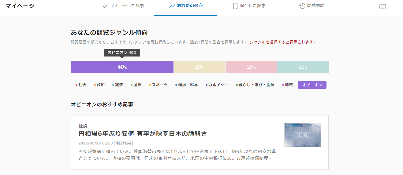 これまで「マイニュース」だったサービスは「マイページ」に名称を変更しました。フォローした特集や連載の新着記事のチェックが簡単になり、連載名から過去の記事を辿ることも可能です。読んだ記事は閲覧傾向がグラフ化されるので、よく読んだジャンルを把握することや、これまであまり読んでいなかったジャンルを知るなど、偏りなく情報を収集できるようになります。また、従来の保存機能にメモ機能が追加されました。保存した記事は記事のキーワードやメモから検索ができるので、仕事や学習など幅広い用途でご利用いただけます。「マイページ」はニュースサイトとアプリで連動しているため、異なる端末で読んだ記事も、履歴閲覧機能を使えばすぐに遡ることができるようになりました。