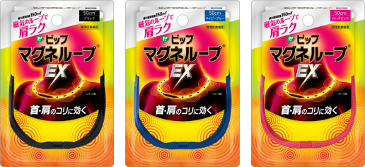 着けるだけで、手軽に首・肩のコリを解消する「ピップマグネループ」。ワンタッチで簡単に着脱でき、軽くてフィットするので、仕事中や就寝中にも快適に使用できます。またお客様のニーズに合わせた、豊富なラインアップを展開しており、コリ悩みの深刻度やカラー、長さのお好みに合わせてお選びいただけます。