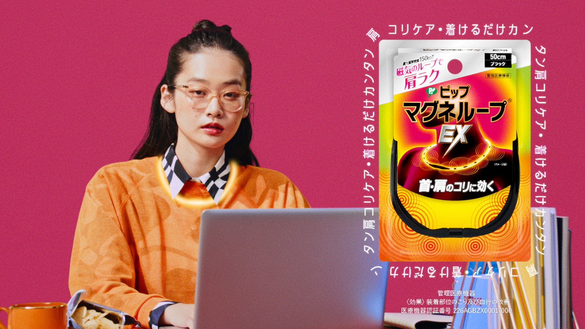 本CMでは、日常生活の中で首や肩コリを感じやすいシーンを切り取り、「リモートワーク篇」「通勤篇」「ランチスマホ篇」「定時まで篇」の4種類のCMを制作、ピップマグネループを着けるだけで簡単にコリが改善していく様子をループ感のある気持ちのよい音楽と映像で表現しています。