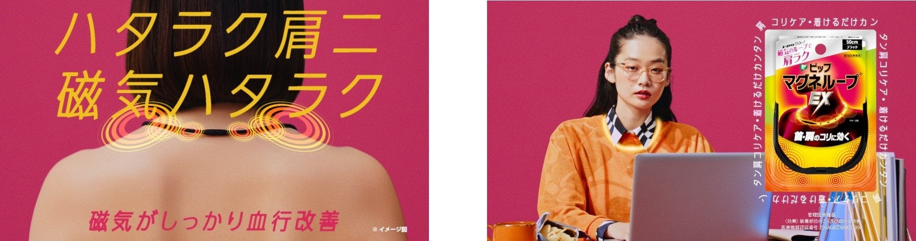 「肩コリに悩んでいるけれど、かといって手間のかかるケアは面倒でしたくない」 「肩コリを感じる日中にケアしたい」「肩コリの悩みがなければもっと仕事の効率があがるのに」など多くの人が感じている首や肩コリのお悩み。そんな皆様のお悩みを「ピップマグネループ」が解決するべく、「いつでもどこでも、簡単に使える」という商品特長を「ハタラク肩ラク カンタン肩ラク」という印象的なリズム音楽にのせて伝えていきます。