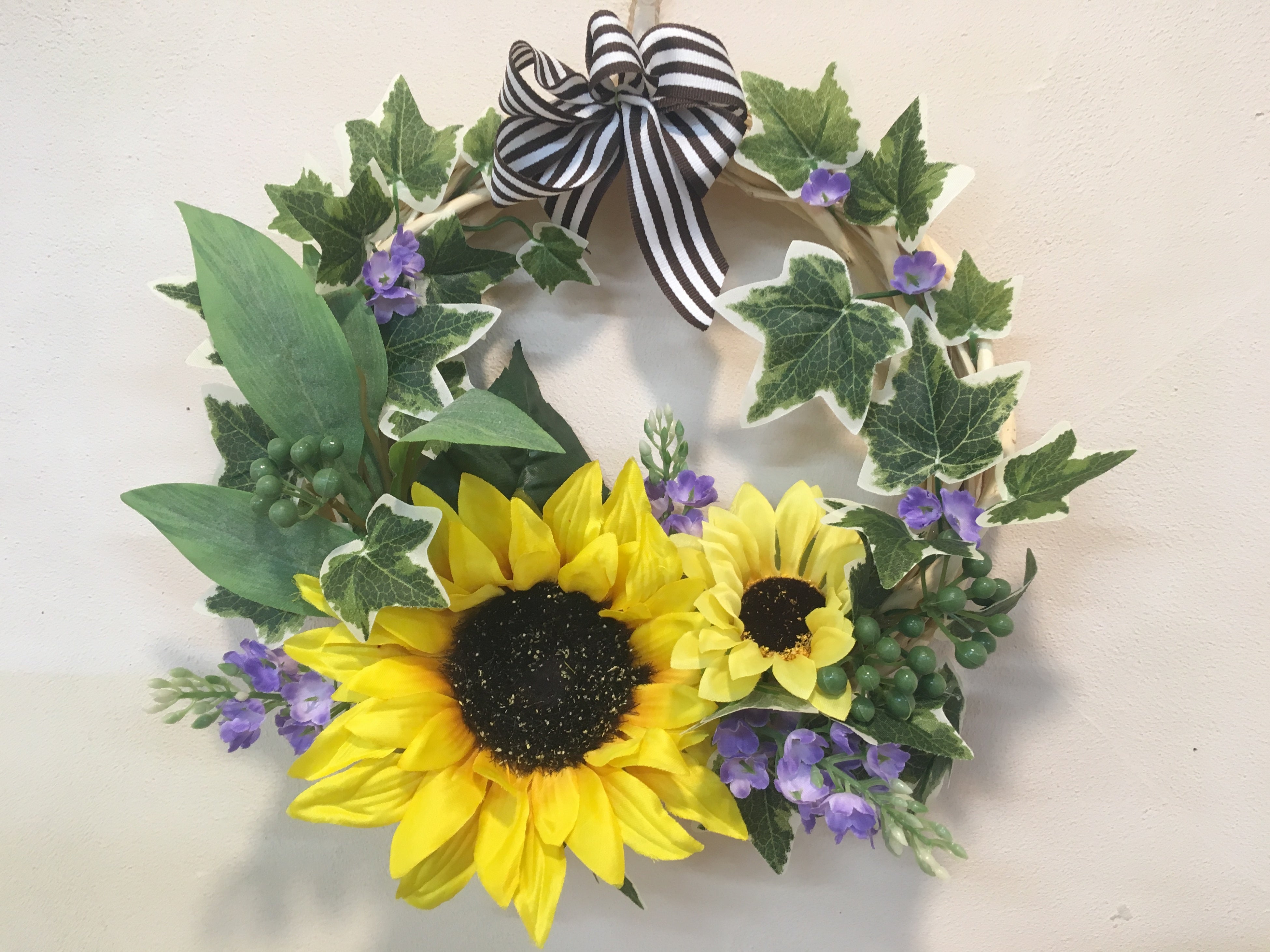爽やかなヒマワリの花に、アイビー、リボンをあしらった夏のリースを作ります。お部屋や玄関をヒマワリが彩ります。