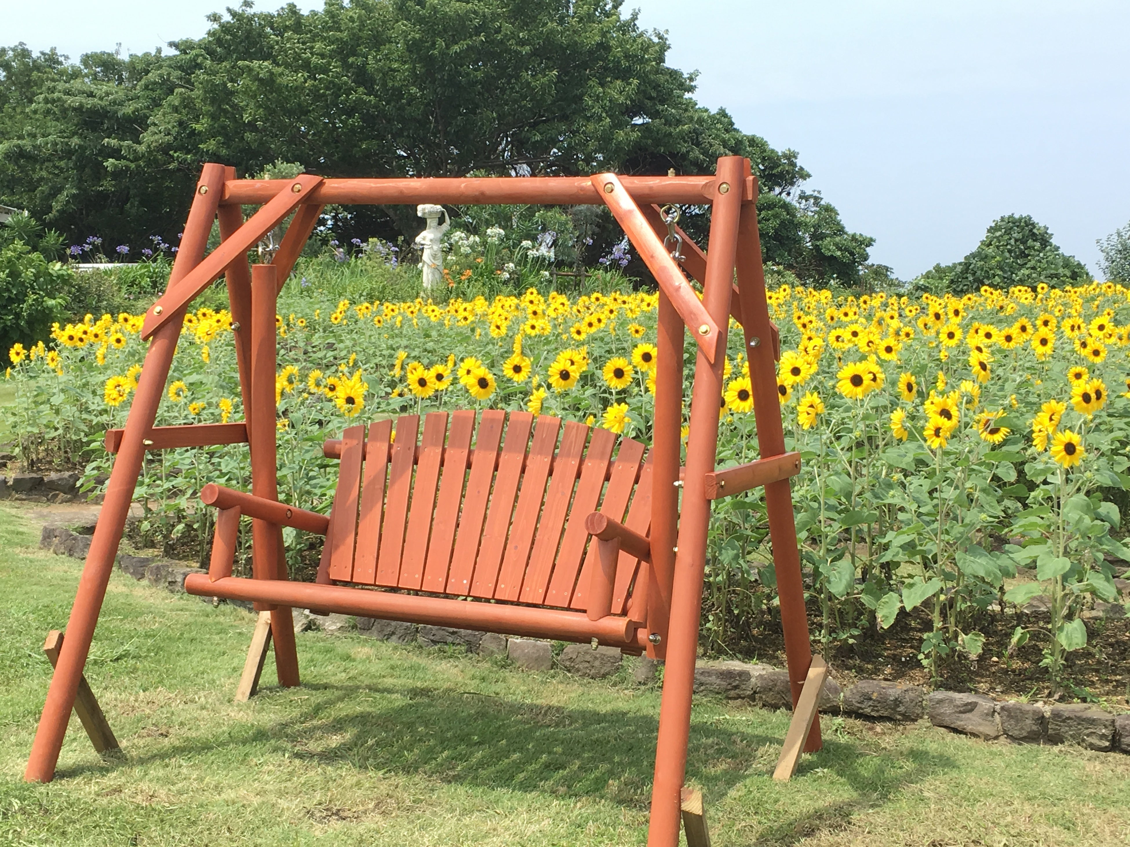 入口ゲートを入ってすぐ目の前に広がる5,000㎡のヒマワリ畑と、相模湾と青空が共演するフォトジェニックな景色は、撮影スポットとしても人気です。