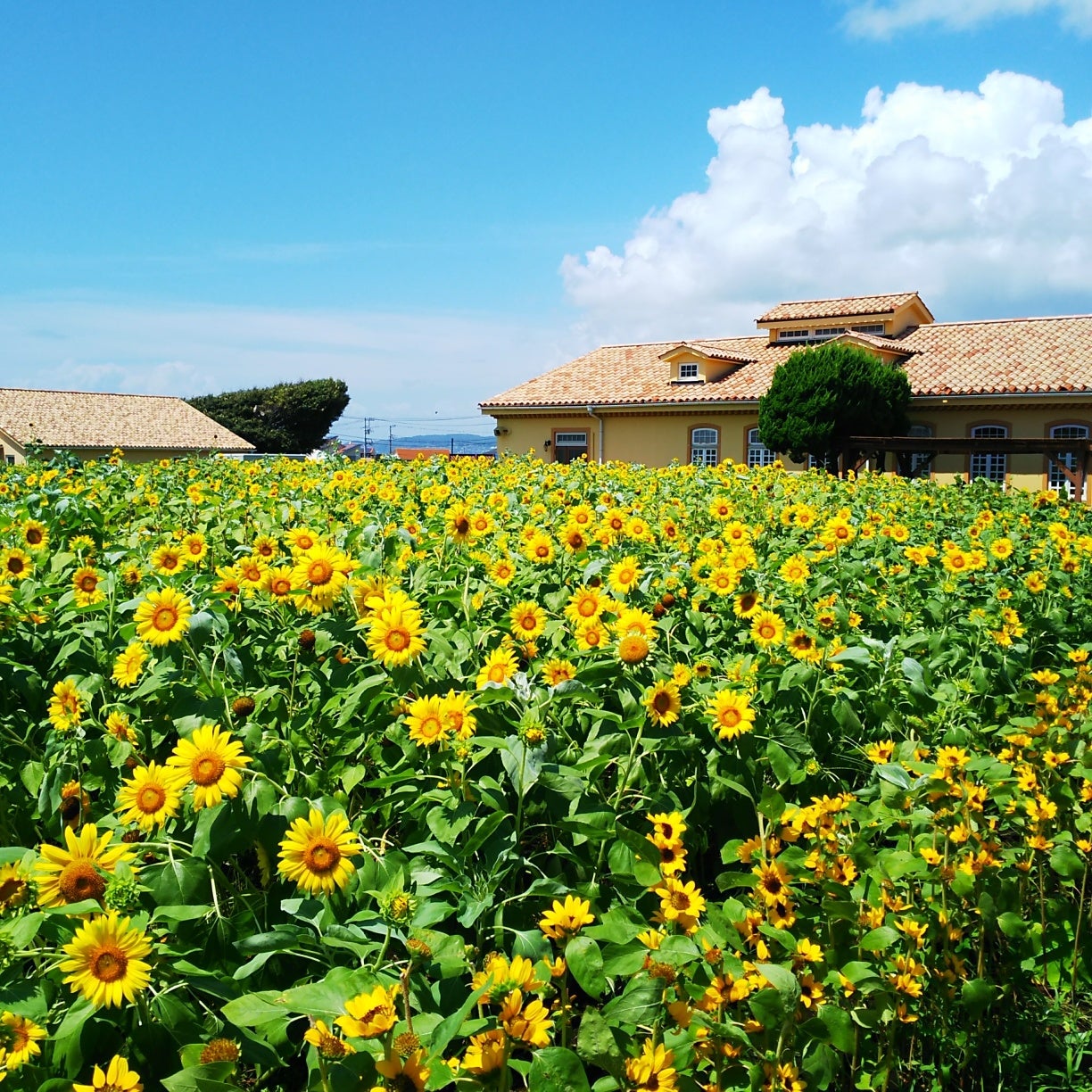 青空と相模湾のブルーに囲まれた『入園無料』のフォトジェニックなヒマワリ畑を、ぜひお楽しみください。