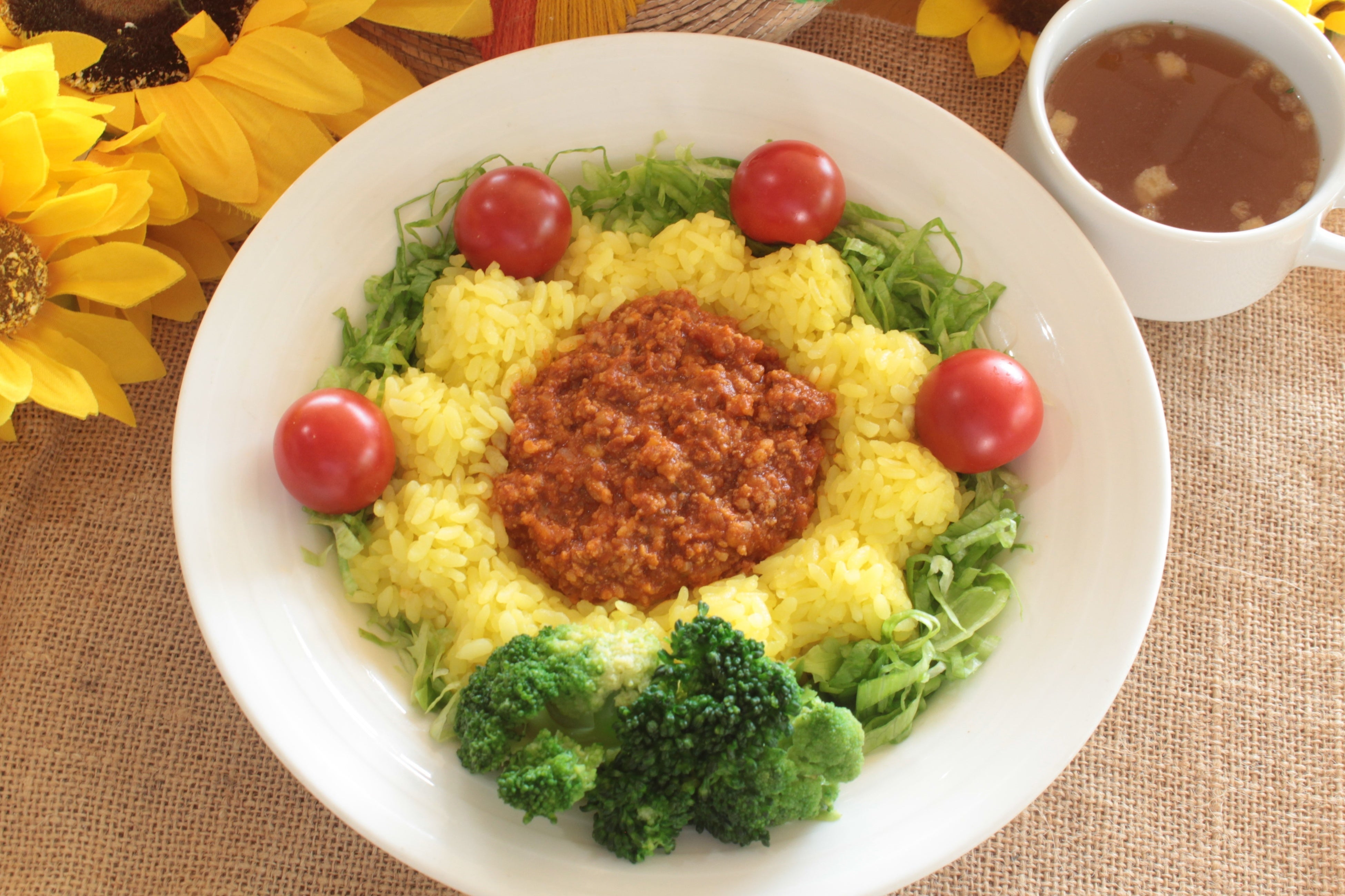 暑い夏に食べたくなるピリッと甘辛いタコライス! お皿の上にも満開のヒマワリが咲きます。