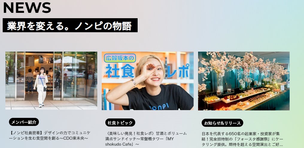 新しい採用ページでは、ノンピのメンバーによる会社・事業・サービス・仲間の魅力や今後の展望についてのメッセージや、日々ノンピが変革を起こし続けるための新たな事業、新店舗やサービスの情報、活躍するメンバーの紹介等をしているブログを紹介しています。