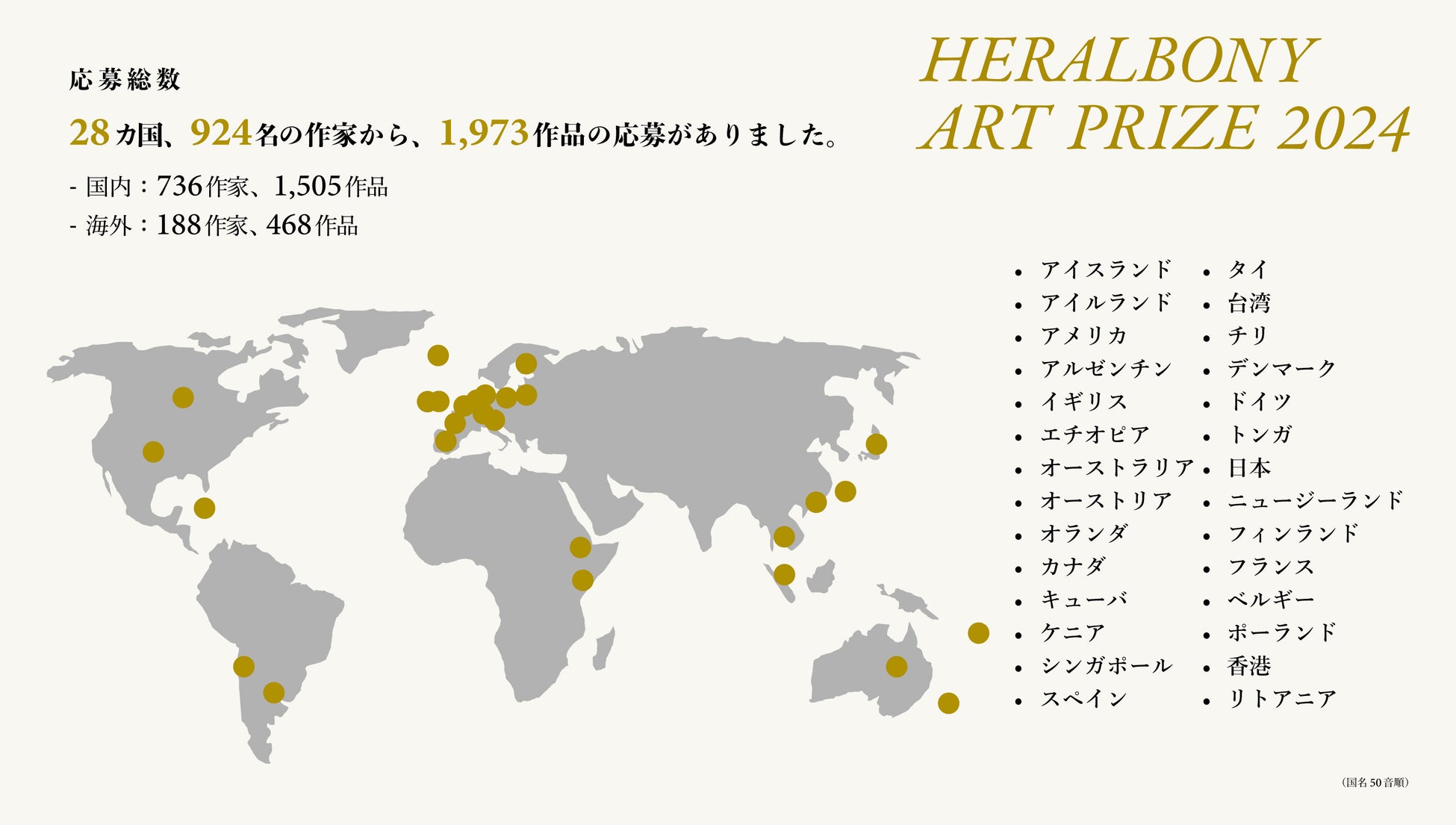 1月31日から3月15日までの応募期間に集まったアート作品の総数は1,973作品。世界28ヵ国から総勢924名のアーティストから本アワードへの応募がありました。審査を通じて、グランプリが1作品、企業賞が7作品、さらに審査員特別賞として4名が選出されます。