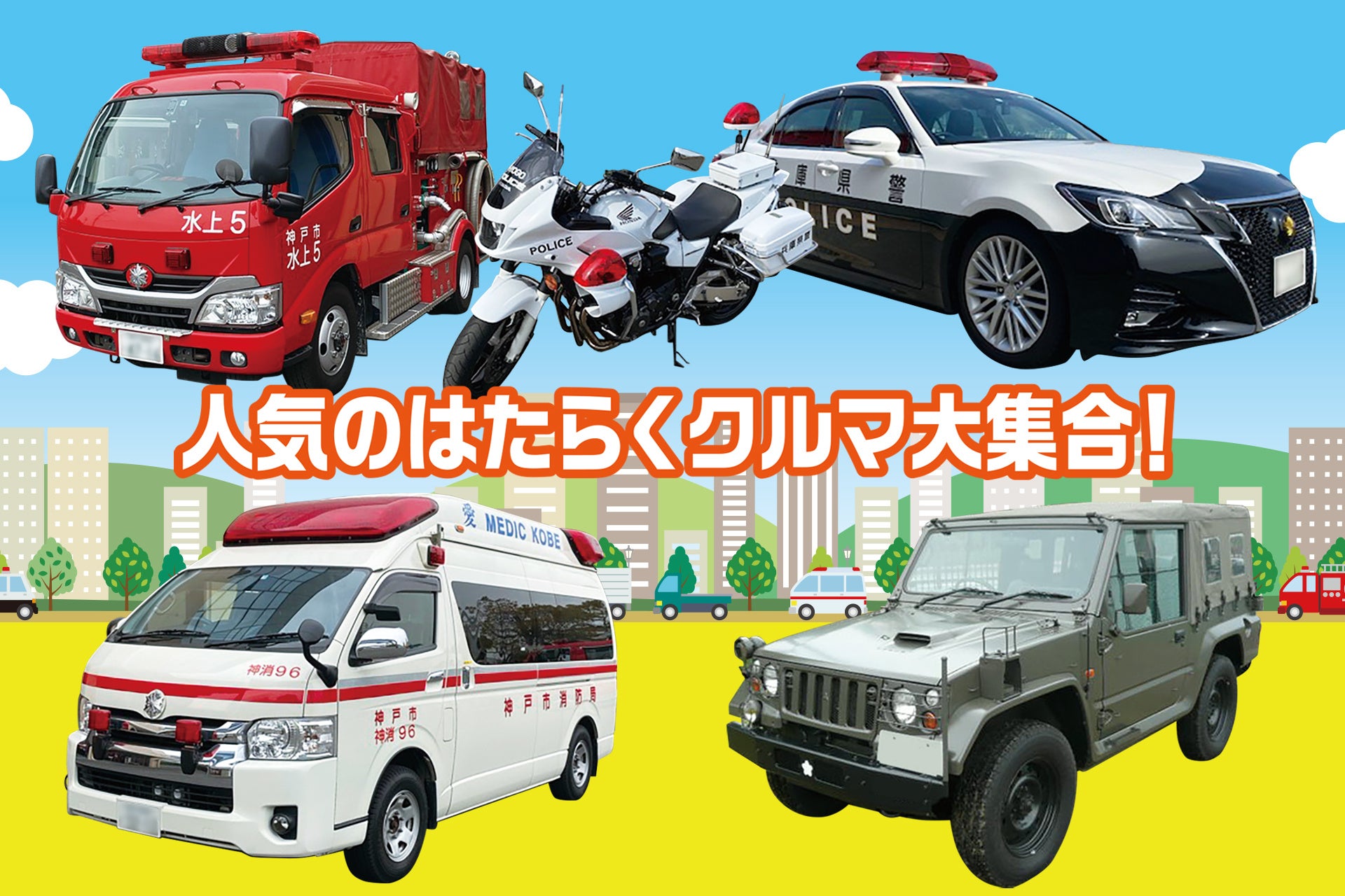 会場では、本物のパトカーや消防車・救急車をはじめ、普段見る機会が少ない水陸両用車や自衛隊車両も展示され、記念撮影もしていただけます。また、親子交通安全教室、防災教室、水消火器やAED体験、AR・VRでの災害体験、子供向け防災DVD上映、防災かるた、防災絵本展示などの体験コーナーや、警察官・消防士・自衛官の制服を着ての写真撮影など、親子で楽しめるイベントが多数開催されます。他にも消防レスキュー隊によるデモンストレーション、イベントのフィナーレには兵庫県警察音楽隊による演奏会もお楽しみいただけます。その他、キッチンカーの飲食コーナーやポートライナーのグッズ販売コーナーもご用意しております。