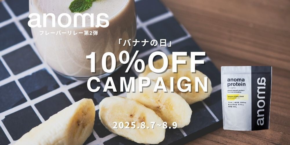 エンドウ豆を主原料とした100%植物性プロテイン「anoma(アノマ)」(本社:東京都新宿区、代表取締役社長:荒井 俊亮)は、特定のフレーバーに焦点を当てたキャンペーン「anoma フレーバーリレー」の第2弾を実施します。第2弾は、8月7日(木)の「バナナの日」にちなみ、2025年8月7日(木)から8月9日(土)までの3日間、公式サイトにてanomaプロテイン バナナシェイクフレーバー 600gを10%OFFで提供します。